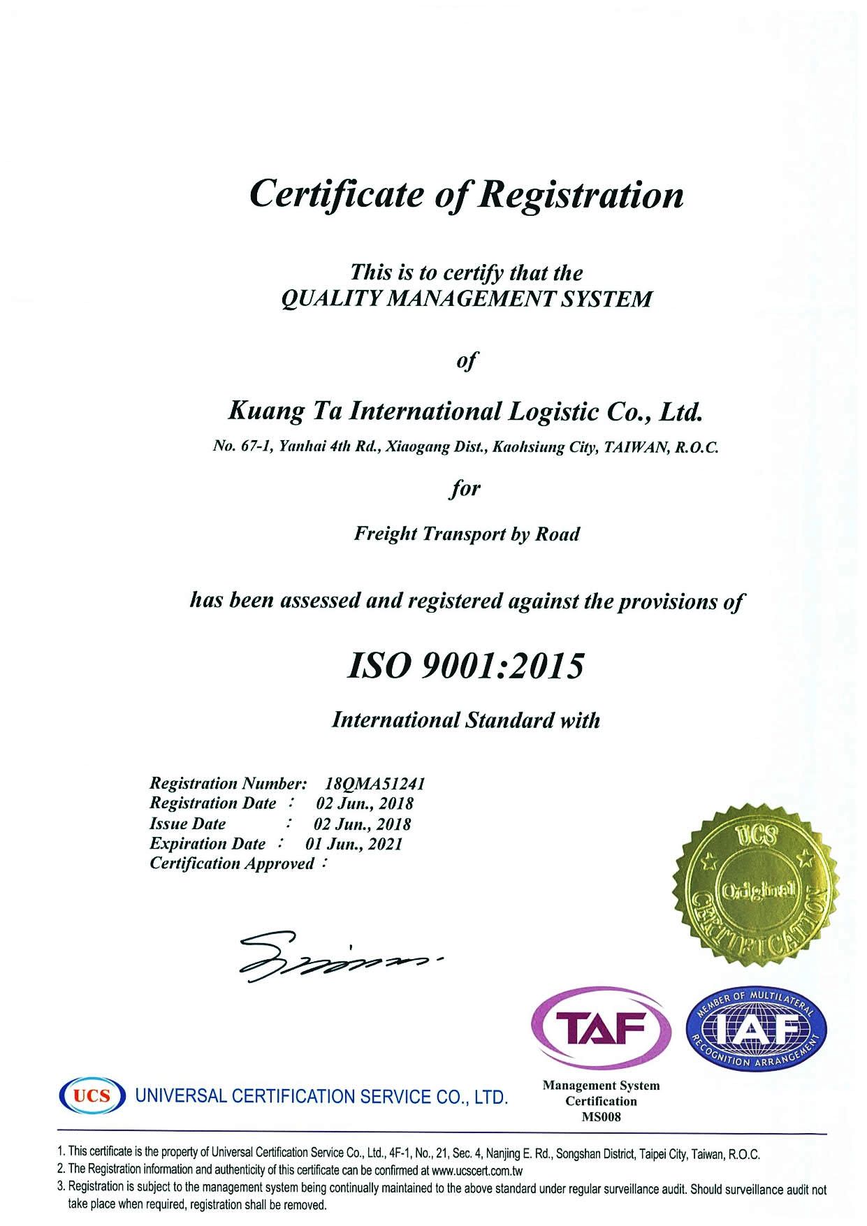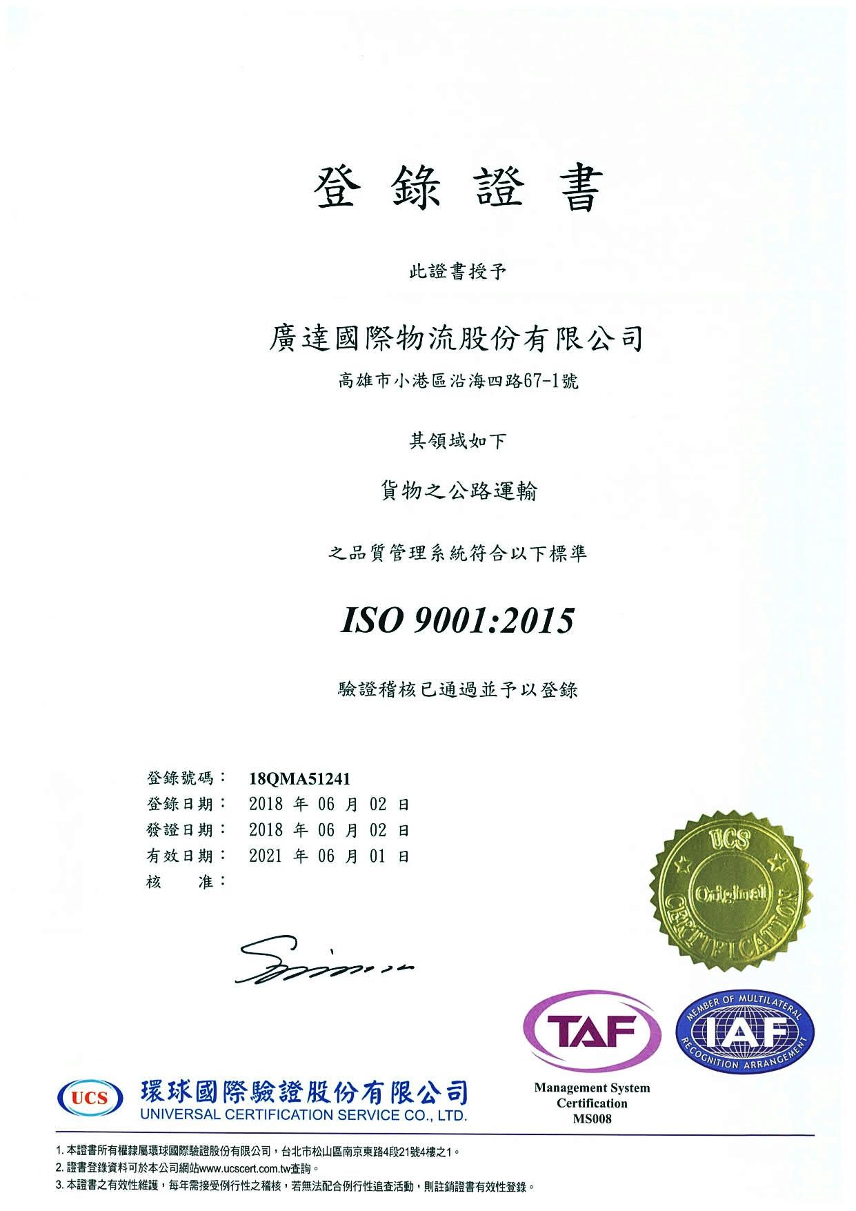 在領導力企管專業顧問輔導下,廣達國際物流股份有限公司已順利完成 ISO 9001:2015 品質管理系統(ISO 9001:2015 Quality Management Systems)教育訓練(Training)、系統建置(Implementing)、外部稽核驗證 (Certification)3大實施流程,並且榮獲 UCS ISO 9001:2015 品質管理系統新版證書。