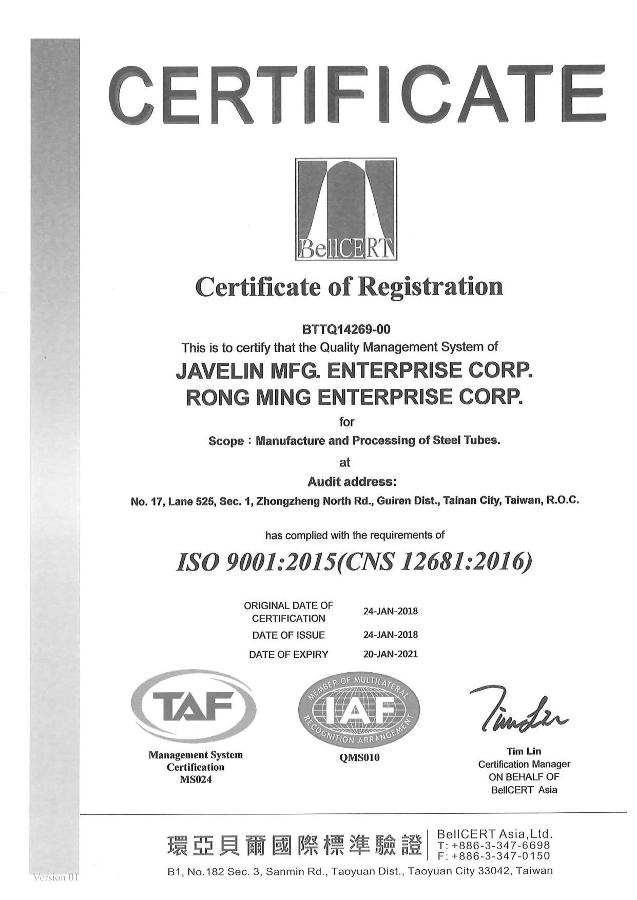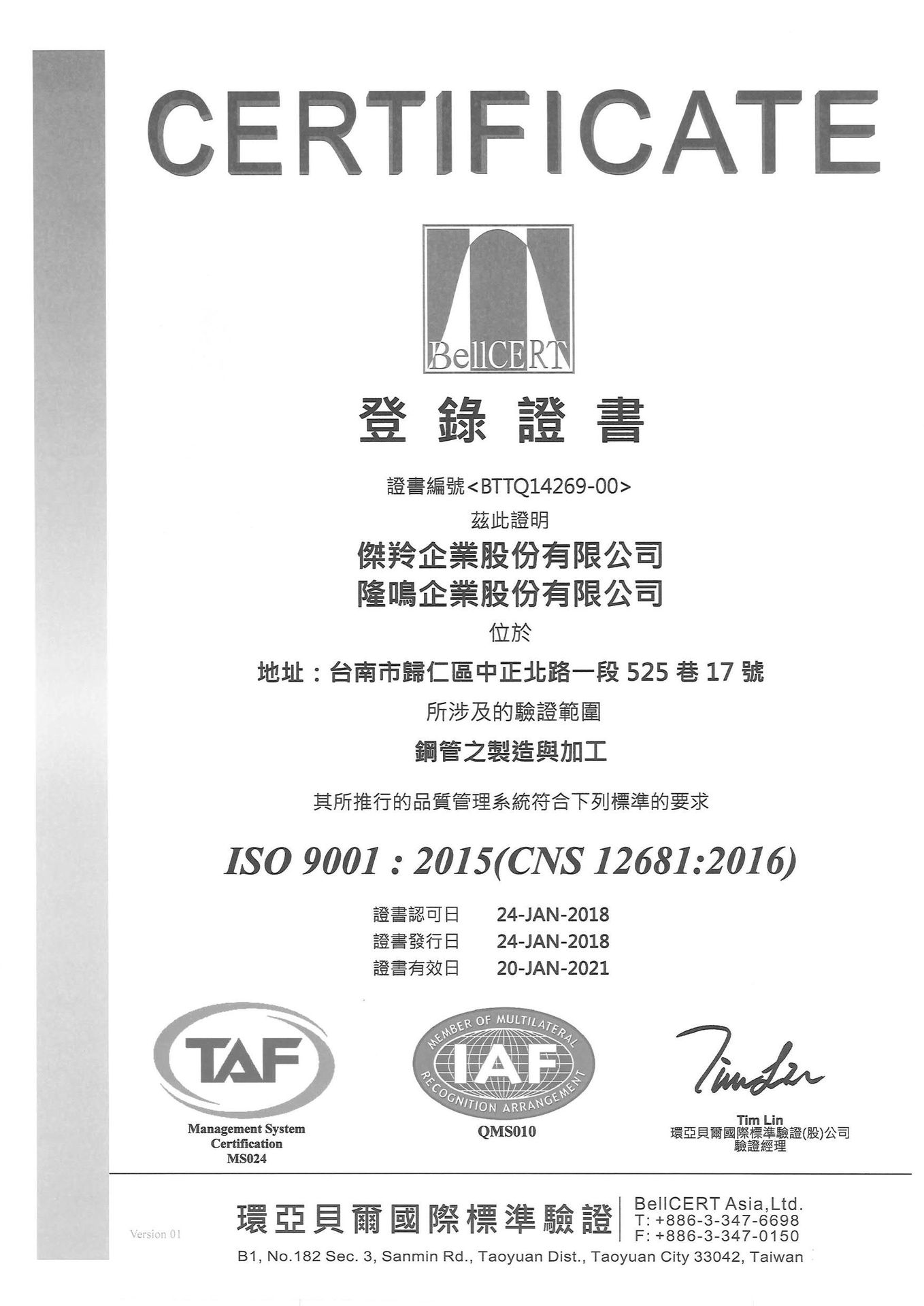 在領導力企管專業顧問輔導下,隆鳴/傑羚企業股份有限公司已順利完成 ISO 9001:2015 品質管理系統(ISO 9001:2015 Quality Management Systems)教育訓練(Training)、系統建置(Implementing)、外部稽核驗證 (Certification)3大實施流程,並且榮獲 AFNOR頒發 ISO 9001:2015 品質管理系統新版證書。