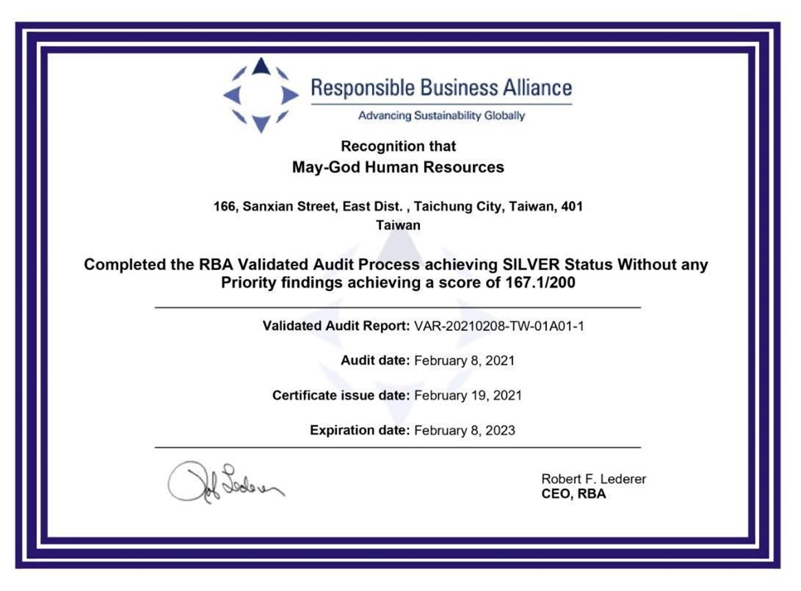 美家人力資源股份有限公司於2021年 接受責任商業聯盟(Responsible Business Alliance,簡稱RBA)之 VAP (Validated Audit Process) 稽核,獲頒 銀級合格證書(審查通過日期為 2021/2/19有效期限至 2023/2/8 止)。RBA VAP為責任商業聯盟針對產業及其供應鏈所訂定之行為準則,確保工作環境的安全、工人受到尊重並有尊嚴、商業營運合乎環保性質並遵守道德操守。