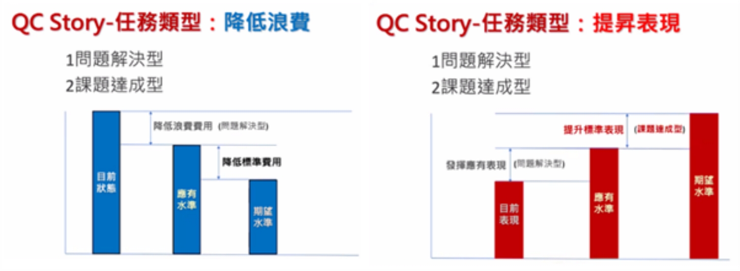 在 QCC 活動中,領導力企管專業顧問透過 QC story,協助同仁依現有活動的狀況,透過討論找到可以提升的或調整的議題,並確認其應有水準與期望水準,訂定 QCC 活動希望的目標,並透過品質七大手法,釐清未能達到應有水準的真正原因 ( 其中原因可能不只一項 ),並引導小組成員集思廣益,找出改善對策,以達到實現降低浪費與提升表現。