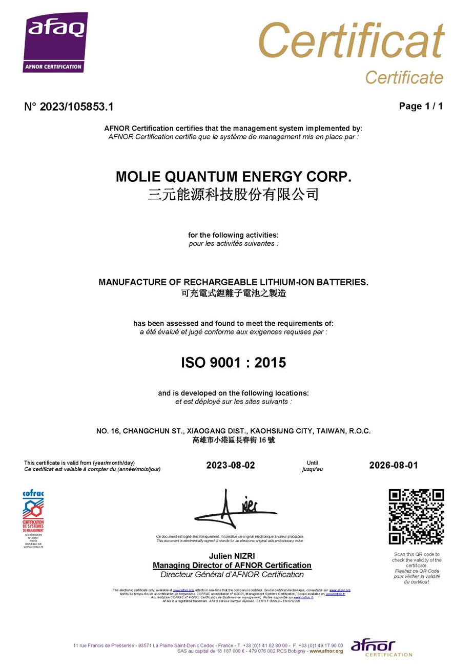 在領導力企管專業顧問的輔導下,三元能源科技股份有限公司已順利完成 ISO 9001:2015 系統(ISO 9001:2015 Quality Management Systems)的教育訓練、系統建置及外部稽核驗證三大實施流程,並成功取得 ISO 9001:2015 證書且通過續評。