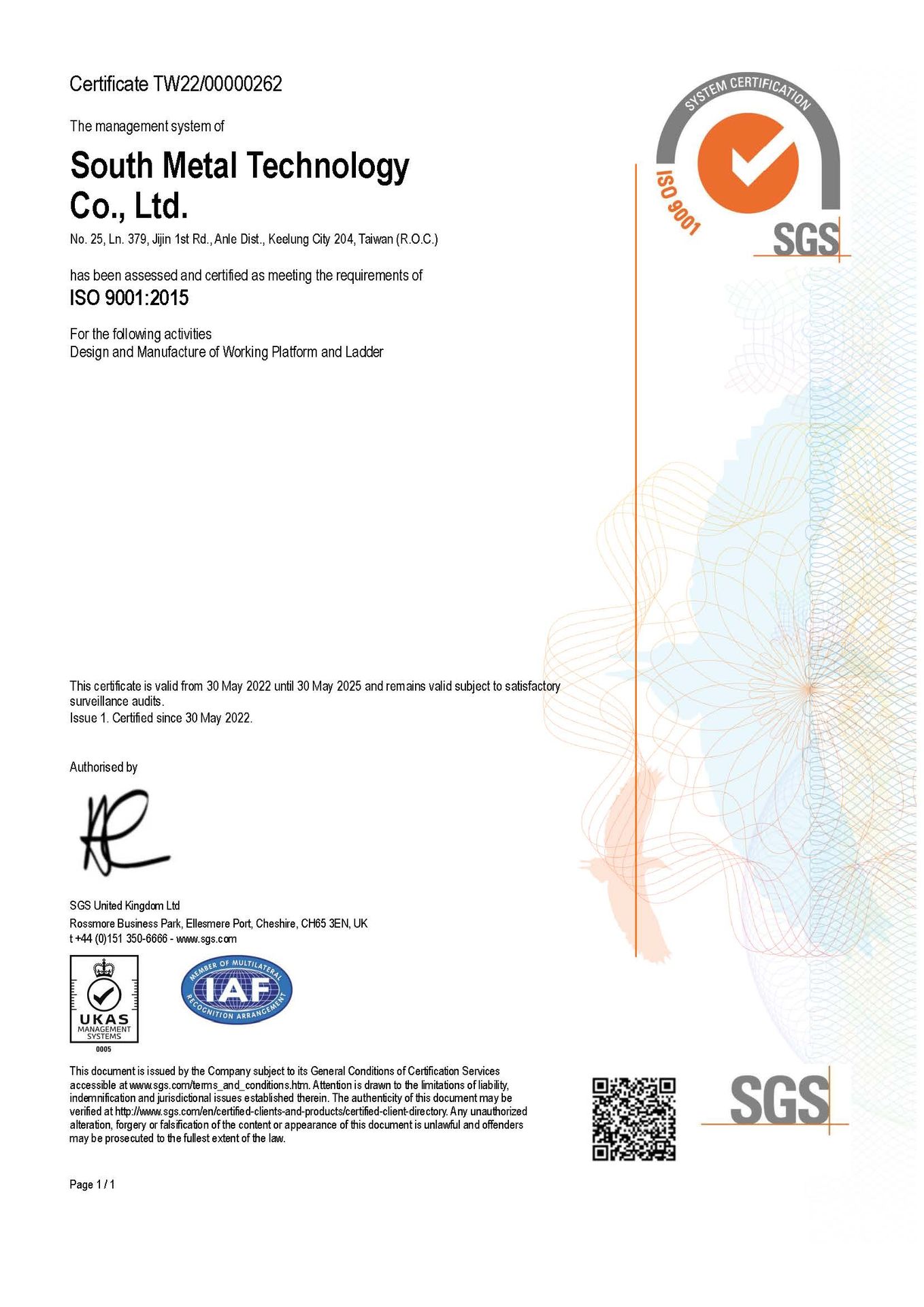 在領導力企管專業顧問輔導下,南方金屬科技有限公司已順利完成 ISO 9001:2015 系統(ISO 9001:2015 Quality Management Systems)教育訓練(Training)、系統建置(Implementing)、外部稽核驗證 (Certification)3大實施流程,順利取得 ISO 9001:2015 證書。