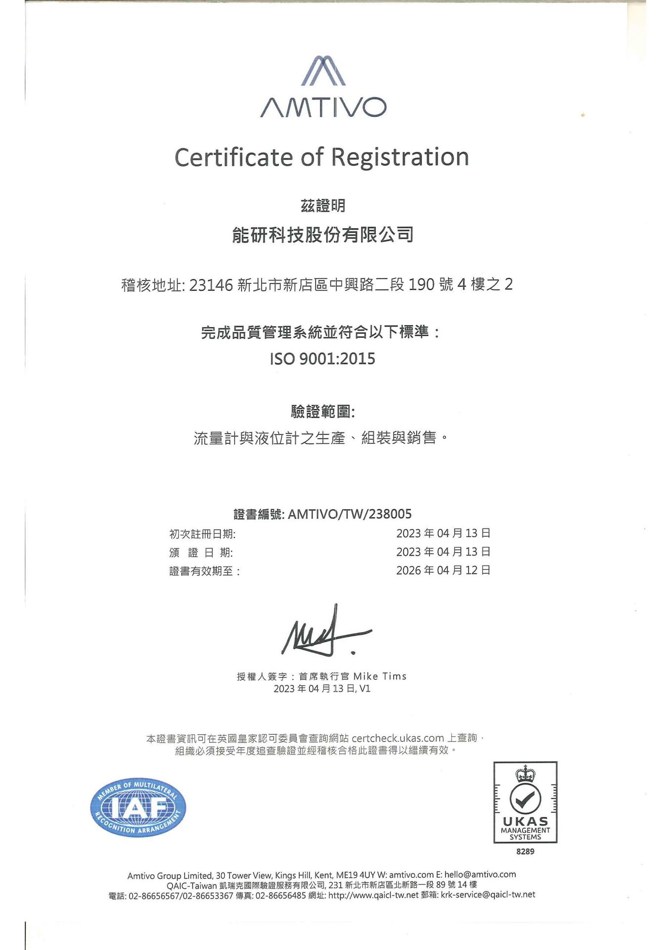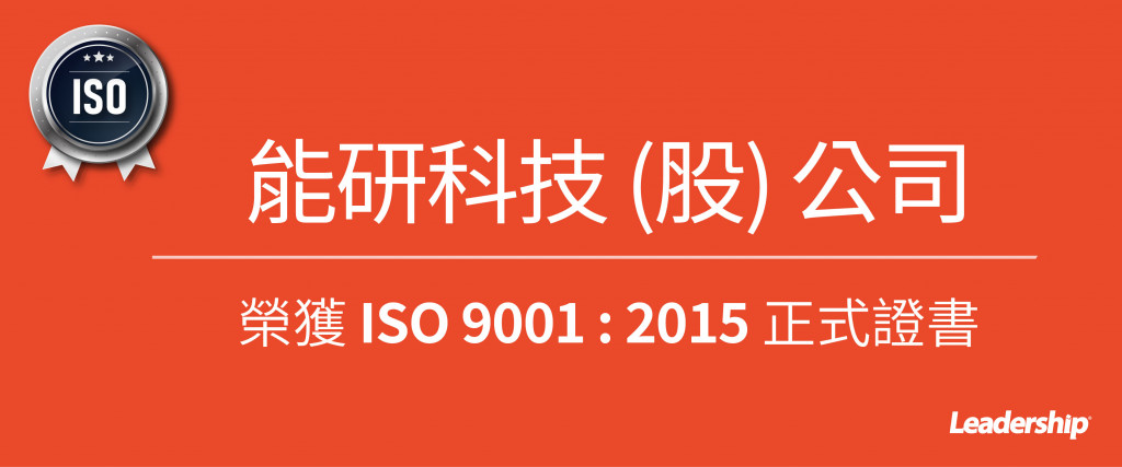 在領導力企管專業顧問輔導下,能研科技股份有限公司 已順利完成 ISO 9001 :2015 系統(ISO 9001 :2015 Quality Management Systems)教育訓練(Training)、系統建置(Implementing)、外部稽核驗證 (Certification)3大實施流程,順利取得 ISO 9001 :2015 證書。