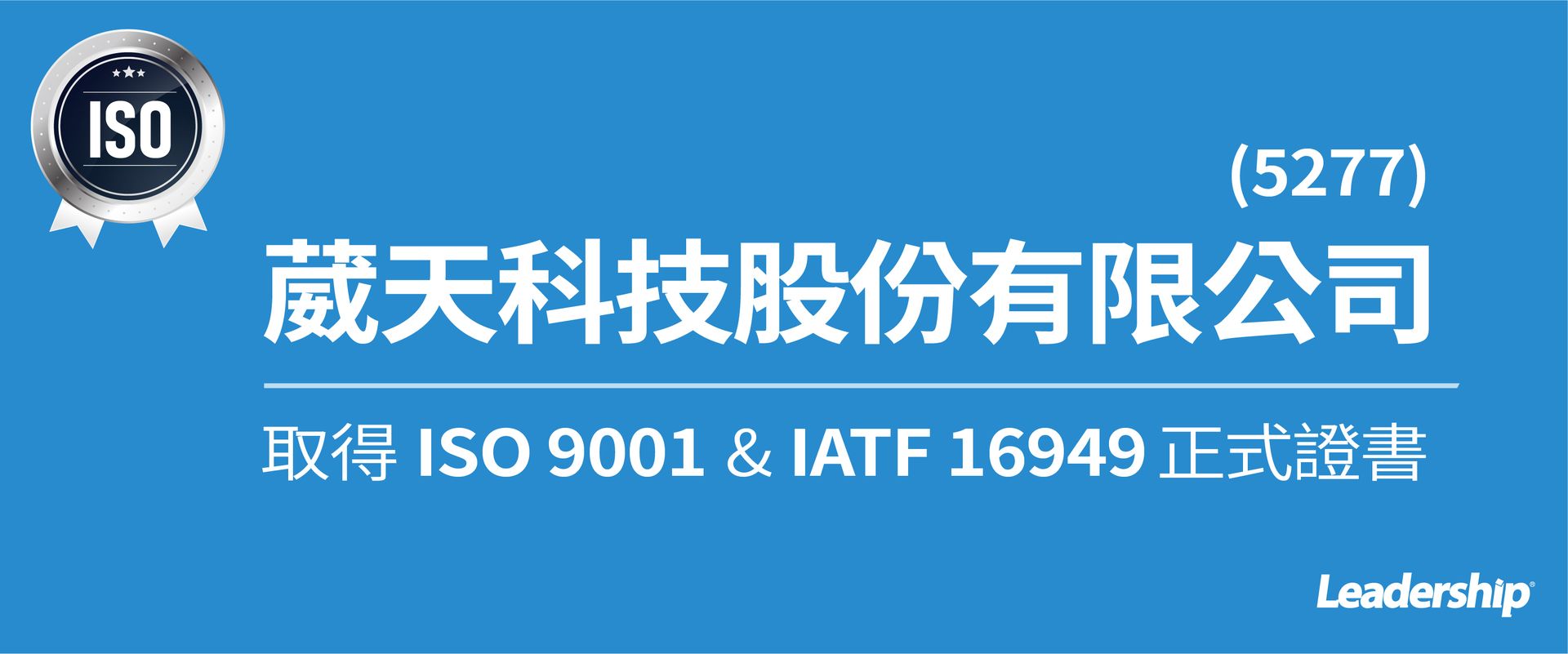 在領導力企管專業顧問輔導下,葳天科技股份有限公司(5277)已順利完成 ISO 9001 :2015 系統(ISO 9001 :2015 Quality Management Systems)及 IATF 16949:2016 汽車產業品質管理系統要求(the requirements of a quality management system for organizations in the automotive industry)教育訓練(Training)、系統建置(Implementing)、外部稽核驗證 (Certification)3大實施流程,順利取得 ISO 9001:2015 證書及 IATF 16949:2016 證書。