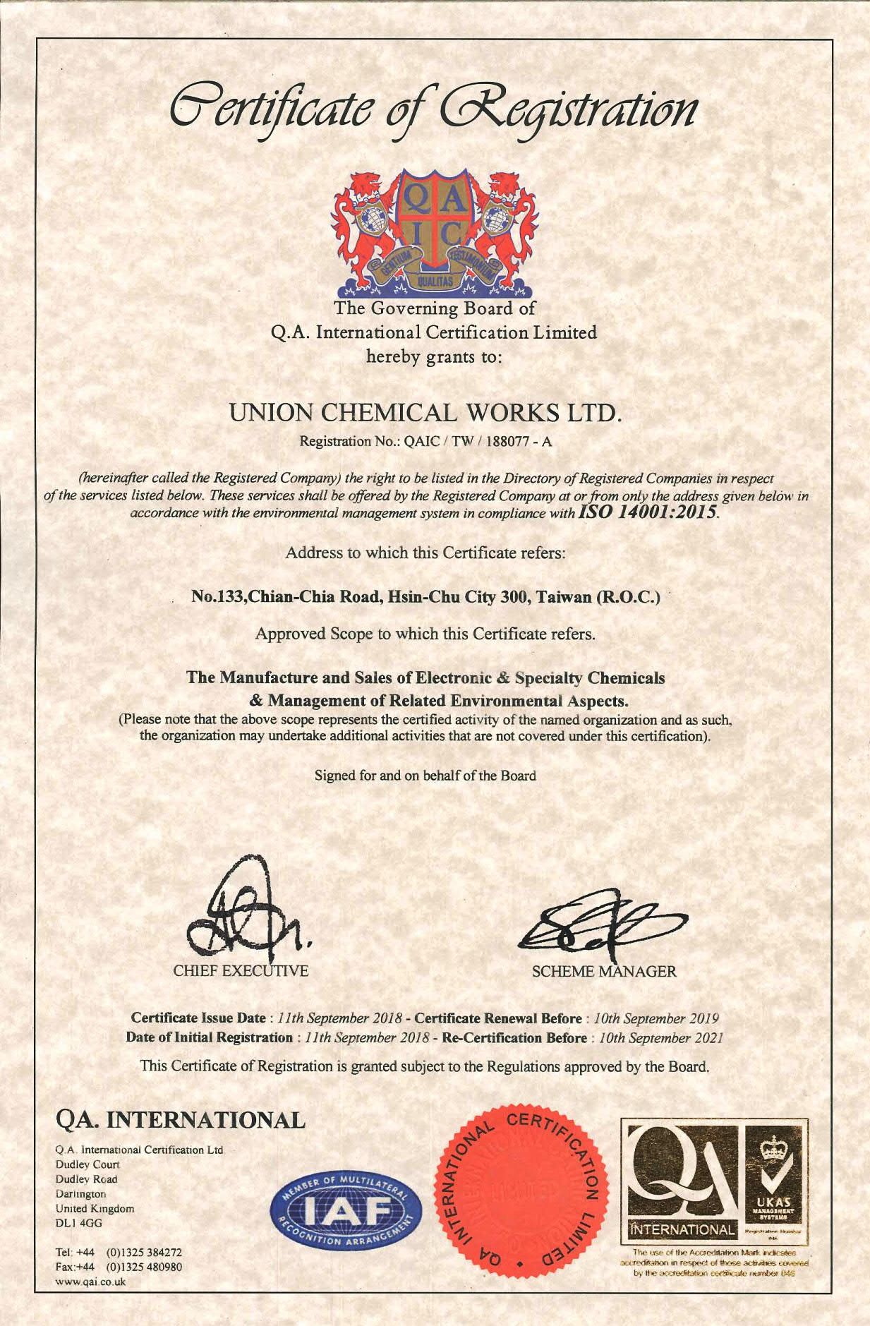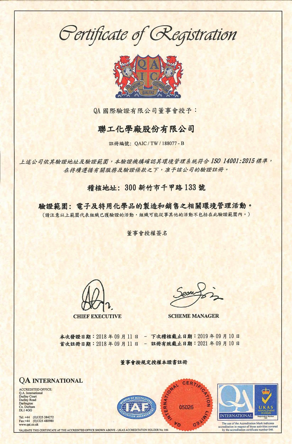 在領導力企管專業顧問輔導下,聯工化學廠股份有限公司已順利完成 ISO 14001:2015 環境管理系統(ISO 14001:2015 Environmental management)教育訓練(Training)、系統建置(Implementing)、外部稽核驗證 (Certification)3大實施流程,並且榮獲 QA 頒發 ISO 14001:2015 環境管理系統新版證書。