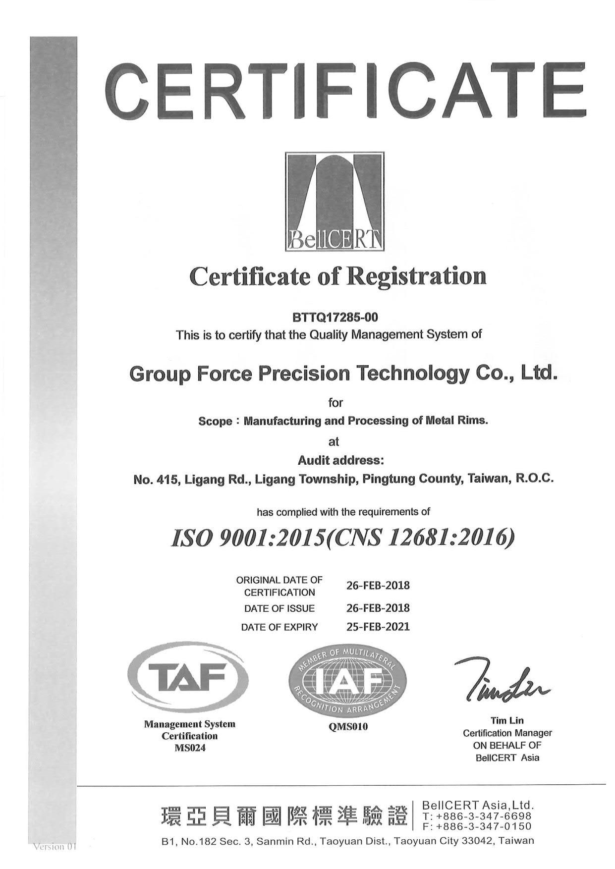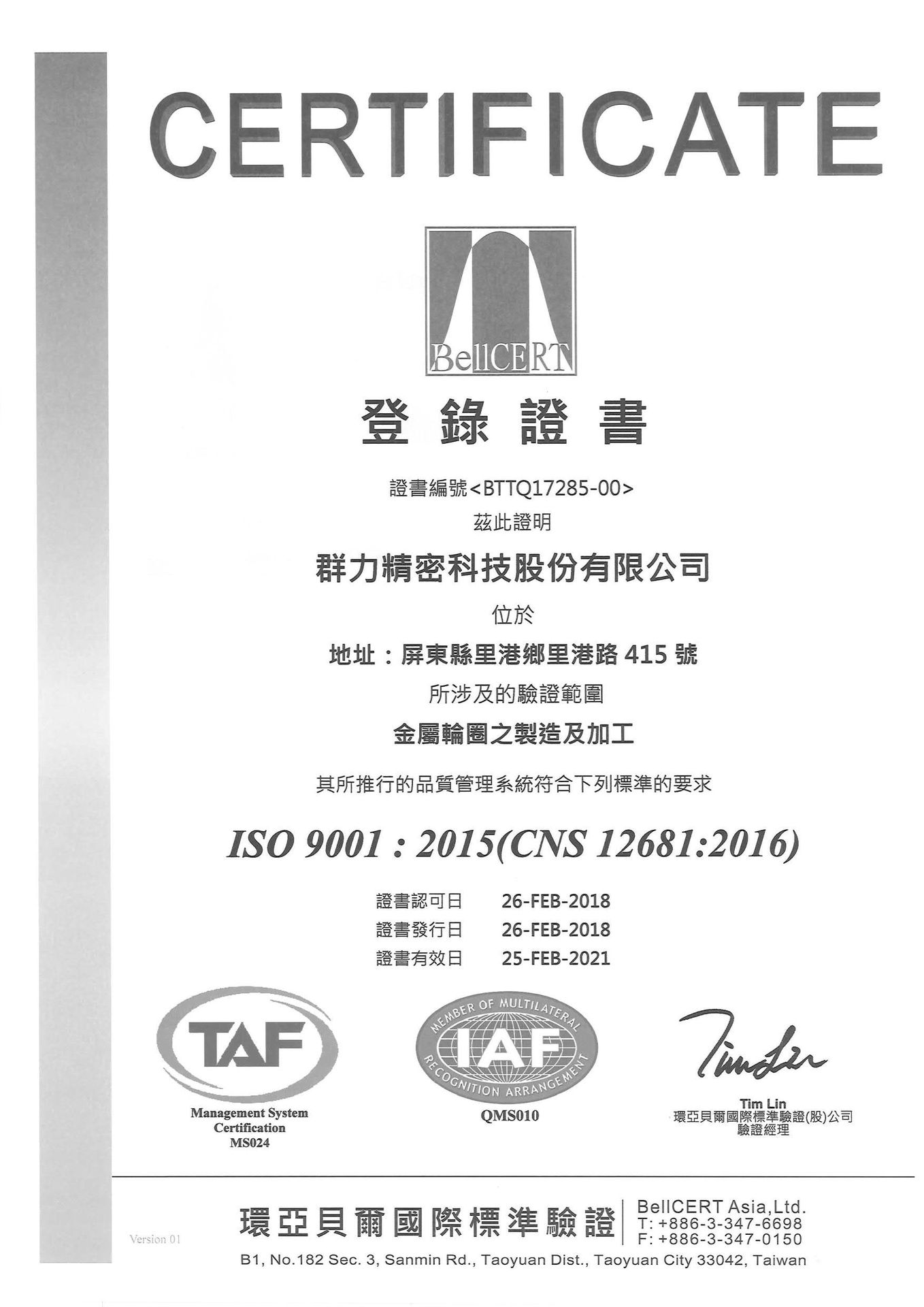 在領導力企管專業顧問輔導下,群力精密科技股份有限公司已順利完成 ISO 9001:2015 品質管理系統(ISO 9001:2015 Quality Management Systems)教育訓練(Training)、系統建置(Implementing)、外部稽核驗證 (Certification)3大實施流程,並且榮獲 AFNOR頒發 ISO 9001:2015 品質管理系統新版證書。