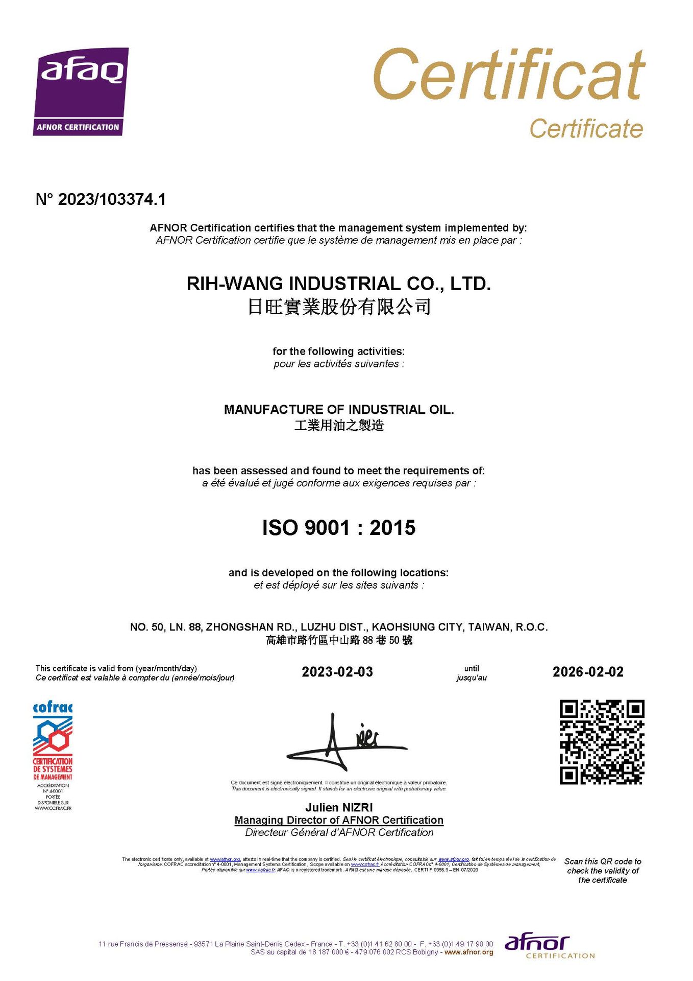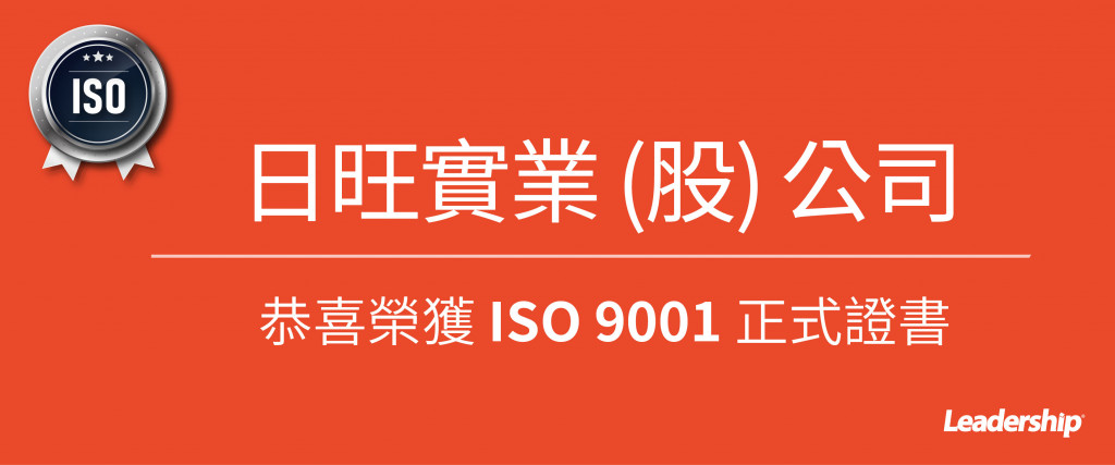 在領導力企管專業顧問輔導下,日旺實業股份有限公司 已順利完成 ISO 9001 :2015 系統(ISO 9001 :2015 Quality Management Systems)教育訓練(Training)、系統建置(Implementing)、外部稽核驗證(Certification)3大實施流程,順利取得 ISO 9001:2015 證書。