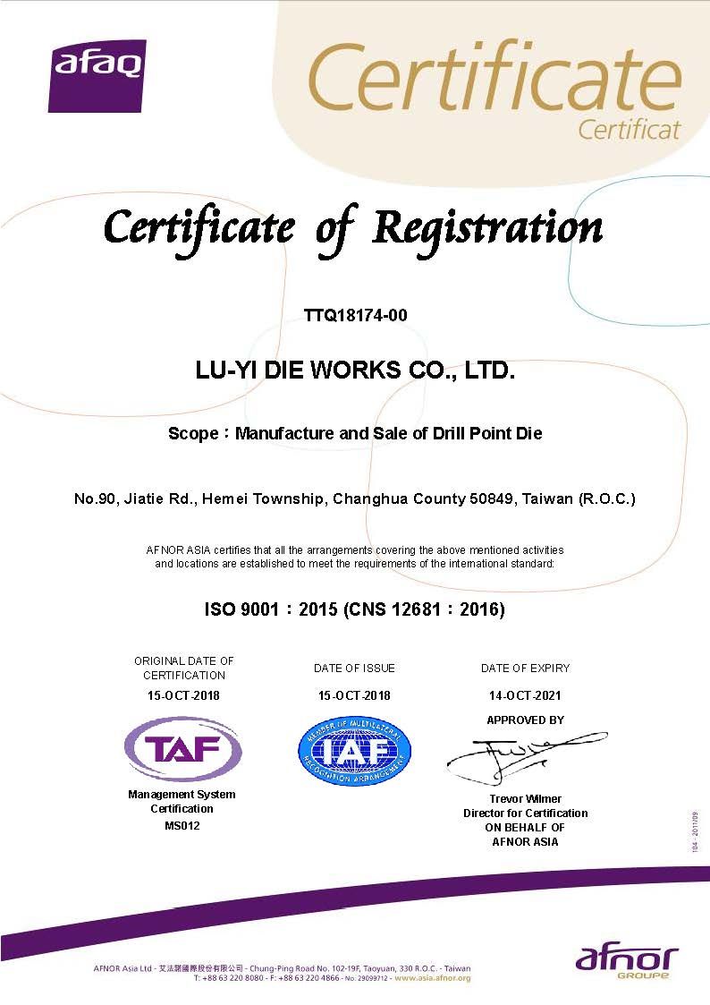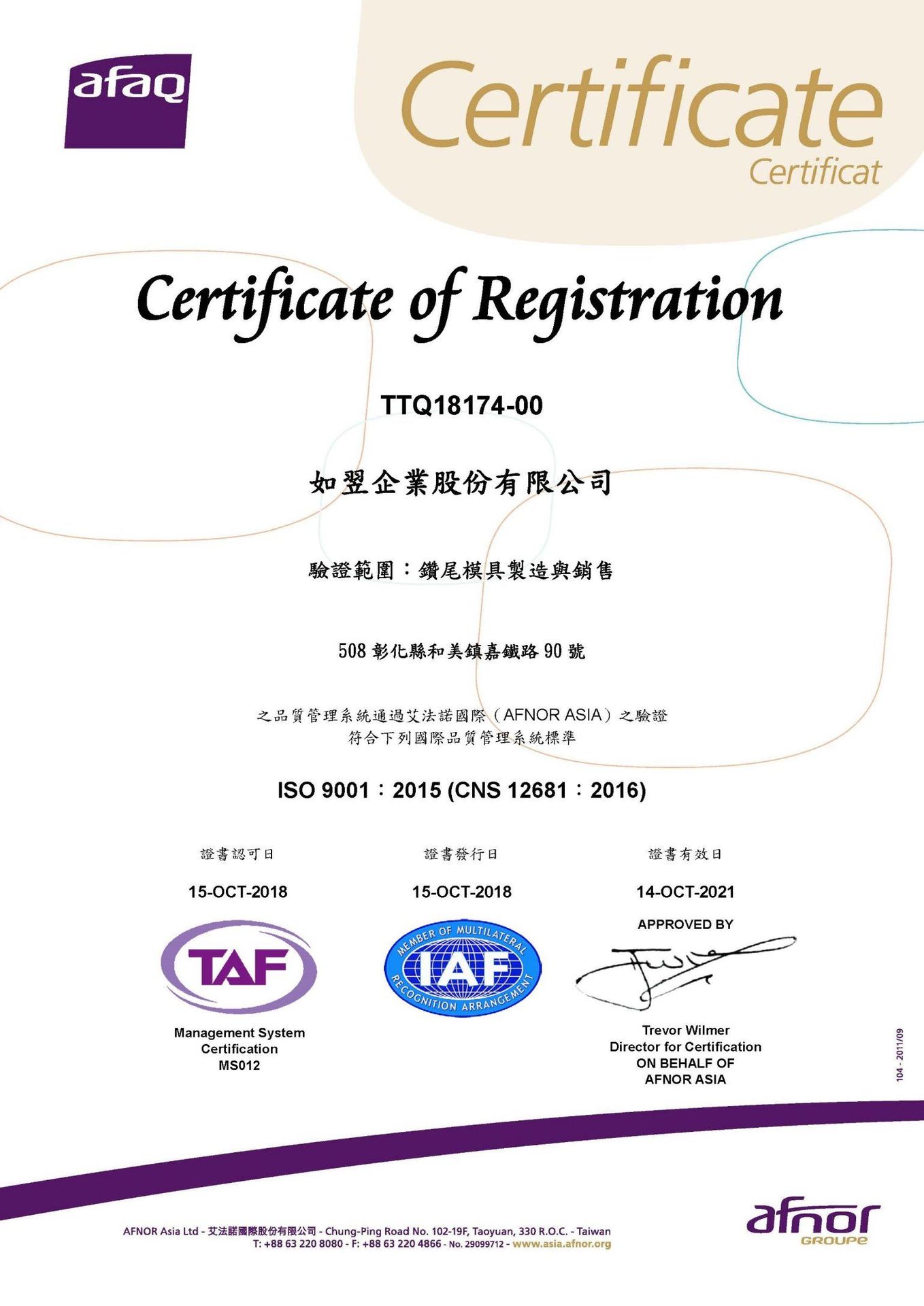 在領導力企管專業顧問輔導下,如翌企業股份有限公司已順利完成 ISO 9001:2015 品質管理系統(ISO 9001:2015 Quality Management Systems) 教育訓練(Training)、系統建置(Implementing)、外部稽核驗證 (Certification)3大實施流程,並且榮獲 ISO 9001:2015 品質管理系統新版證書。