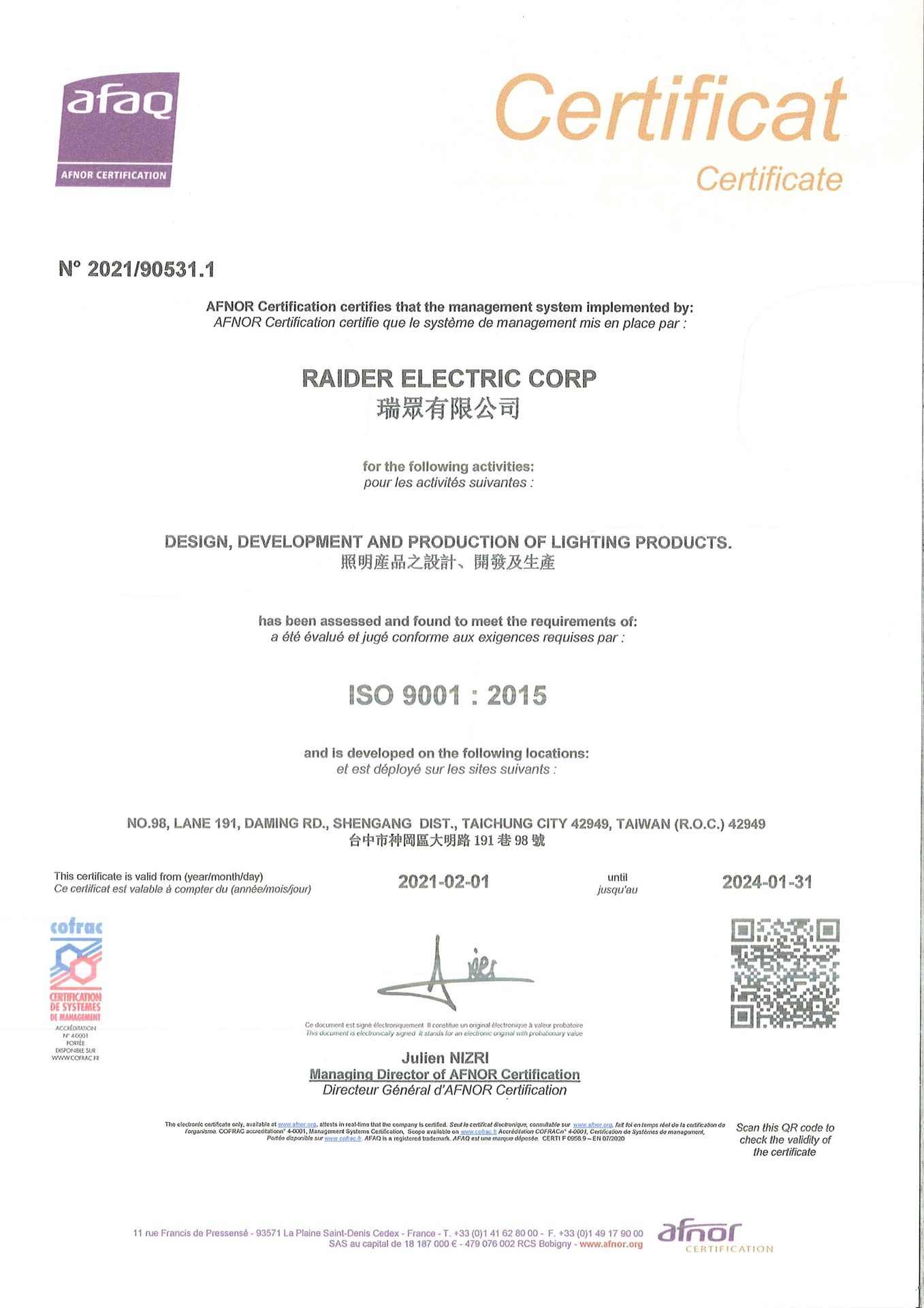 在領導力企管專業顧問輔導下,瑞眾有限公司已完成 ISO 9001:2015 品質管理系統(ISO 9001 :2015 Quality Management Systems)教育訓練(Training)、系統建置(Implementing)、外部稽核驗證 (Certification)3 大實施流程,順利取得 ISO 9001 :2015 品質管理系統證書。
