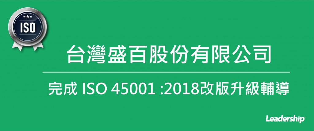 在領導力企管專業顧問輔導下,台灣盛百股份有限公司已順利完成 ISO 45001 :2018 (原 OHSAS 18001)職業安全衛生管理系統(Occupational Health and Safety Management Systems)教育訓練(Training)、系統建置(Implementing)輔導。