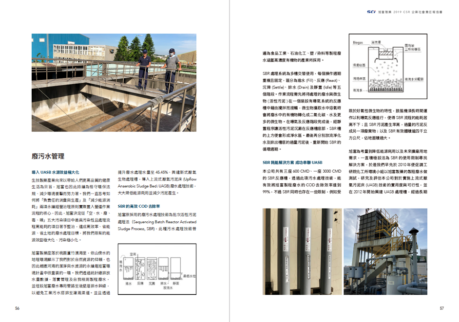 在環境面,旭富持續導入 ISO 14001:2015 環境管理系統,建立長期能源節約策略及手段,如:將鍋爐燃燒用之燃料油重油,改為低污染燃料天然氣,藉此大幅降低PM2.5 排放;增建大型厭氧槽提升對污水處理之能力,減低污水排放對於海洋生態資源的影響;埋設廢水專用管路至後壁厝,以避免工業污水排放至灌溉渠道。