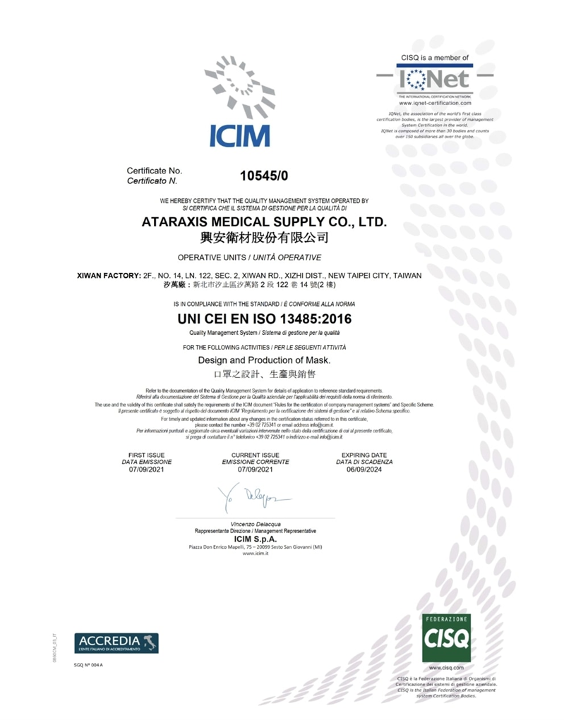 醫療器材品質管理系統主要是針對醫療器材產業所建立的品質管理系統標準,有助於建立廠內標準化流程,是各國法規廣泛採用的標準。興安衛材也於 2021 年 9 月順利通過 ISO 13485:2016 的驗證,並於9月中旬正式取得證書。