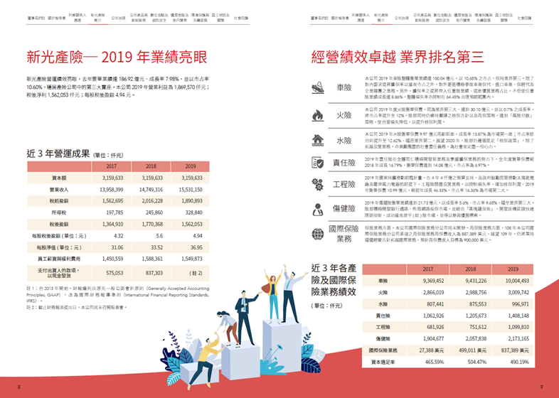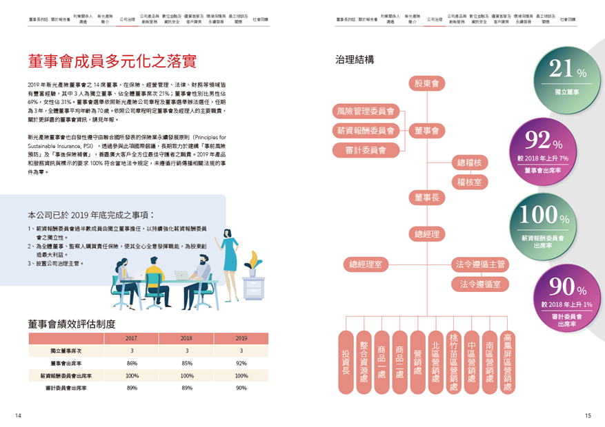 在領導力企管專業顧問輔導下,新光產物保險股份有限公司順利完成企業社會責任報告書編製,並且符合 SDGs永續發展目標、GRI永續性報導準則、ESG原則以及 CSR原則之要求。新光產險 2019年的報告書為公司發行的第 6本 CSR Report,新光產險積極實踐企業社會責任已行之有年,每年藉由跨部門小組會議界定報告書內容和主題邊界,並詳盡揭露利害關係人關注的重大主題。