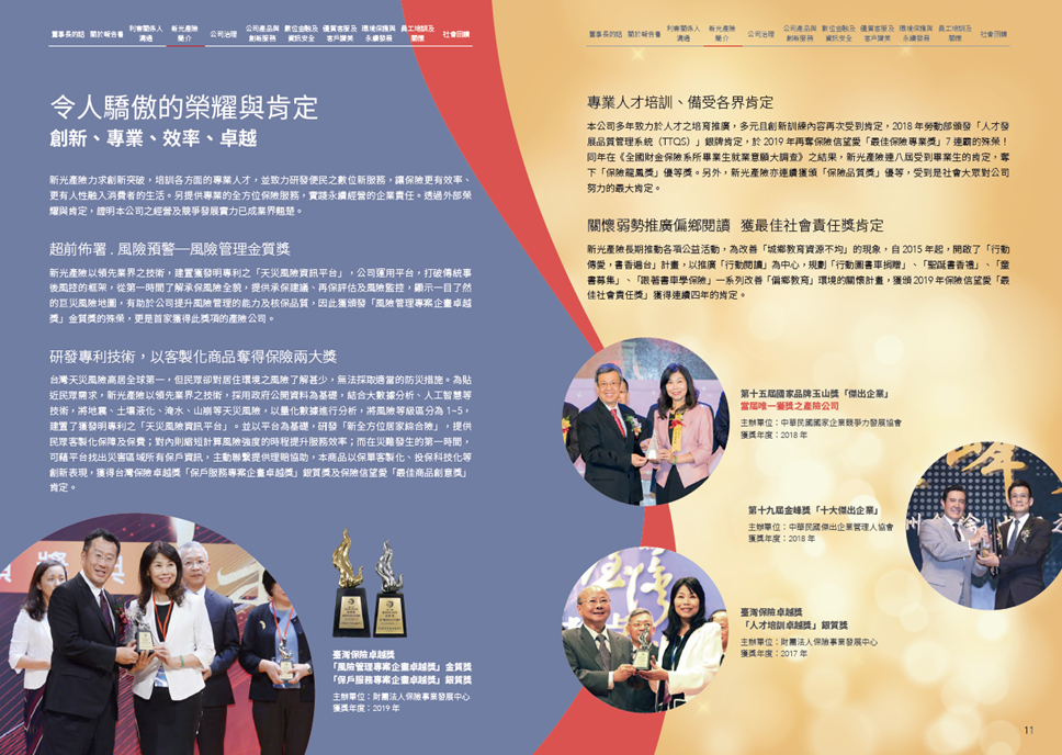 在新光產險 2019年的 CSR Report中,亦率先回應金管會保險局要把氣候變遷的相關風險評估納入保險業自我風險跟清償能力評估報告的要求。新光產險為因應氣候變遷連年加劇,領先業界技術自行研發將天災分類、建立災害潛勢量化機制的「天災風險巨量資料加值應用服務平台」(天災風險平台),作為未來針對氣候相關風險與機會的公司策略規劃。並與以此平台為基礎所研發的「新全方位居家綜合險」,獲得台灣保險卓越獎「保戶服務專案企畫卓越獎」銀質獎及保險信望愛「最佳商品創意獎」肯定。