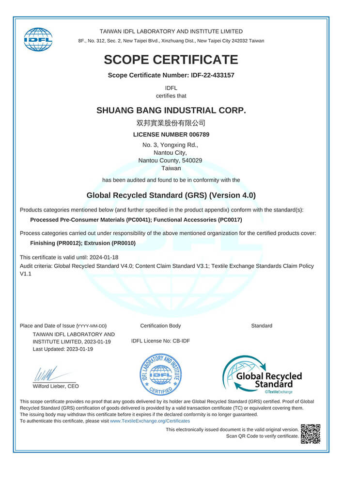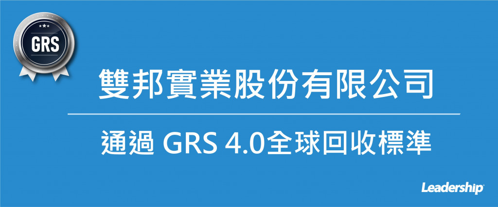 恭喜雙邦實業取得 GRS 4.0 全球回收標準證書