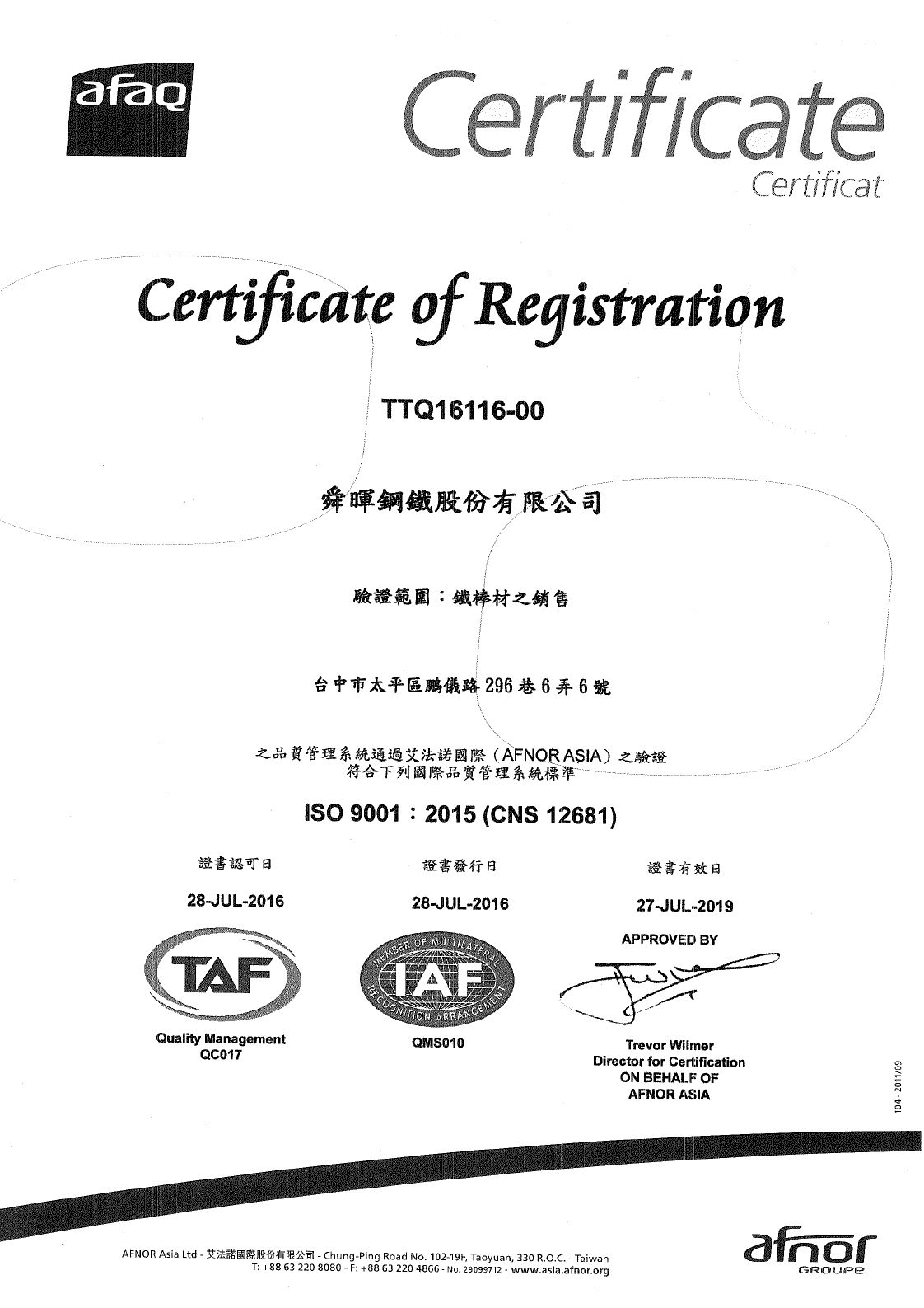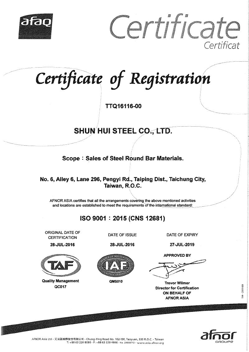 在領導力企管專業顧問輔導下,舜暉鋼鐵股份有限公司已順利完成 ISO 9001:2015 品質管理系統(ISO 9001:2015 Quality Management Systems) 教育訓練(Training)、系統建置(Implementing)、外部稽核驗證 (Certification)3大實施流程,並且榮獲 AFNOR 頒發 ISO 9001:2015 品質管理系統新版證書。