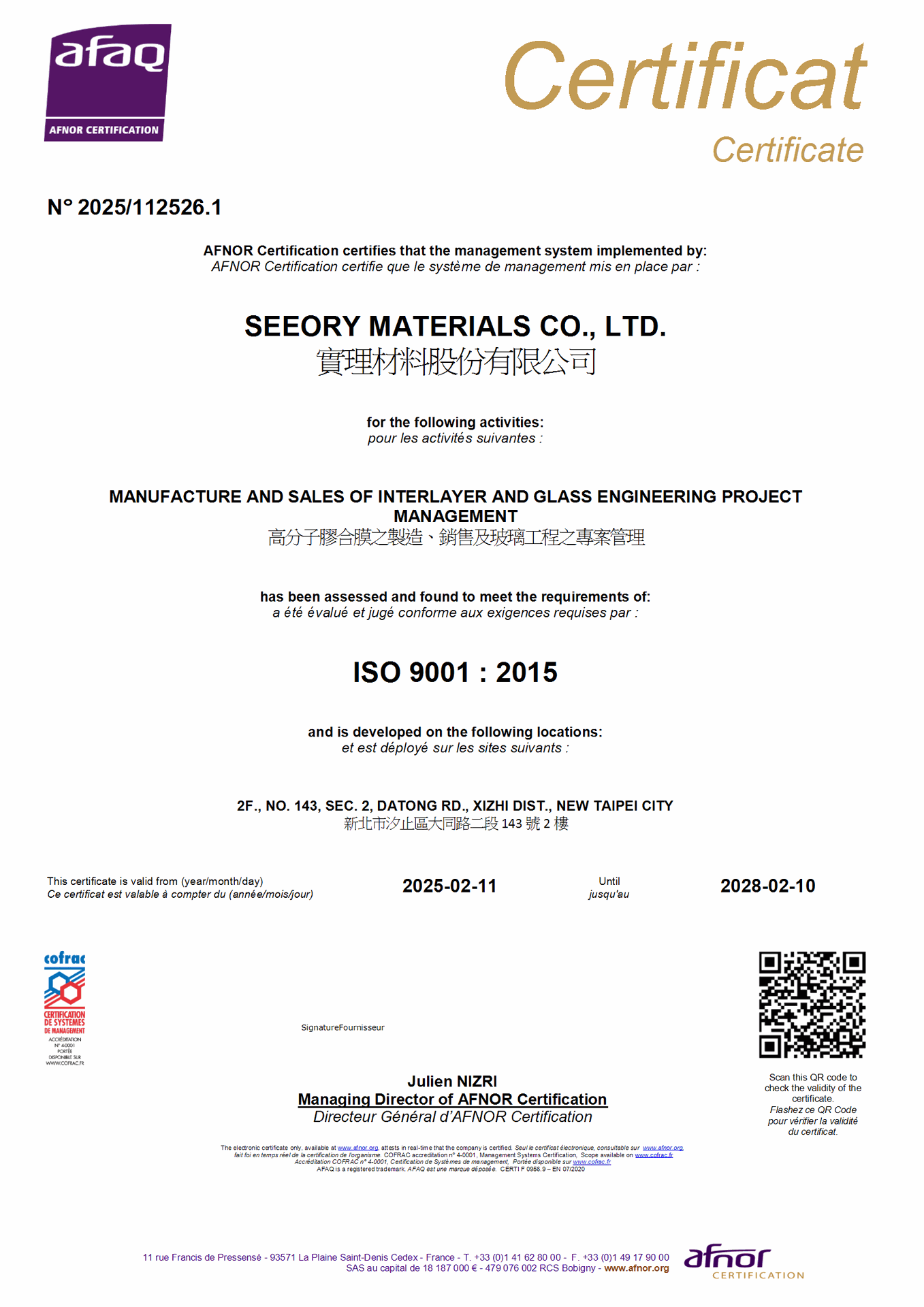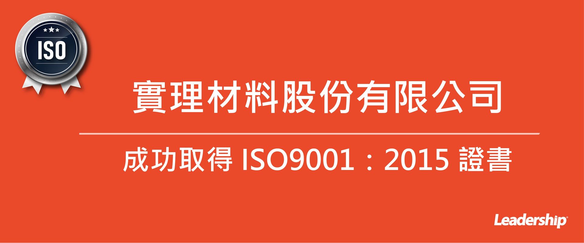 在領導力企管專業顧問輔導下,實理材料股份有限公司已順利完成 ISO 9001 :2015 (ISO 9001 :2015 Quality Management Systems)教育訓練(Training)、系統建置(Implementing)、外部稽核驗證 (Certification)3大實施流程,順利取得 ISO 9001 :2015證書,展現企業對品質管理制度的高度重視與執行決心。