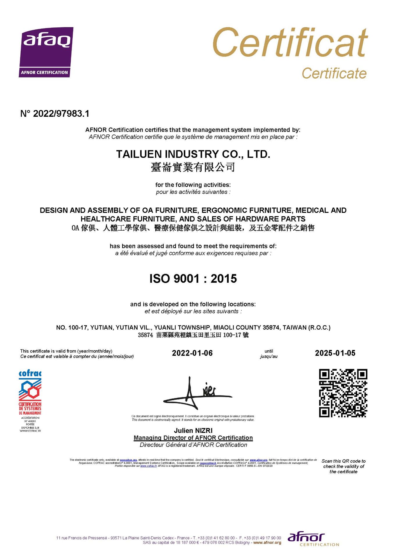 ▲恭喜臺崙實業技取得 ISO 9001:2015 正式證書