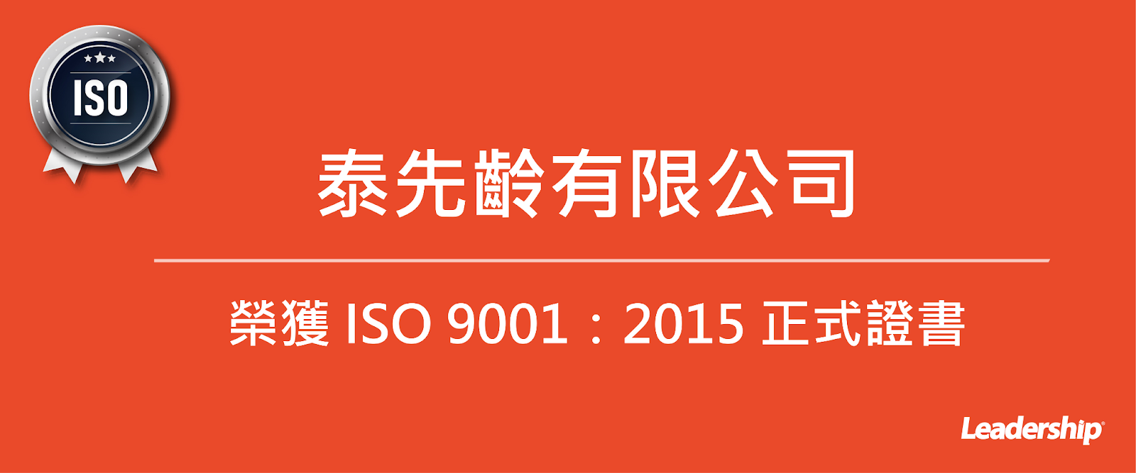 在領導力企管專業顧問輔導下,泰先齡有限公司已順利完成 ISO 9001:2015品質管理系統 (ISO 9001 :2015 Quality Management Systems)教育訓練(Training)、系統建置(Implementing)、外部稽核驗證 (Certification)3 大實施流程,順利取得 ISO 9001 :2015證書且通過續評。