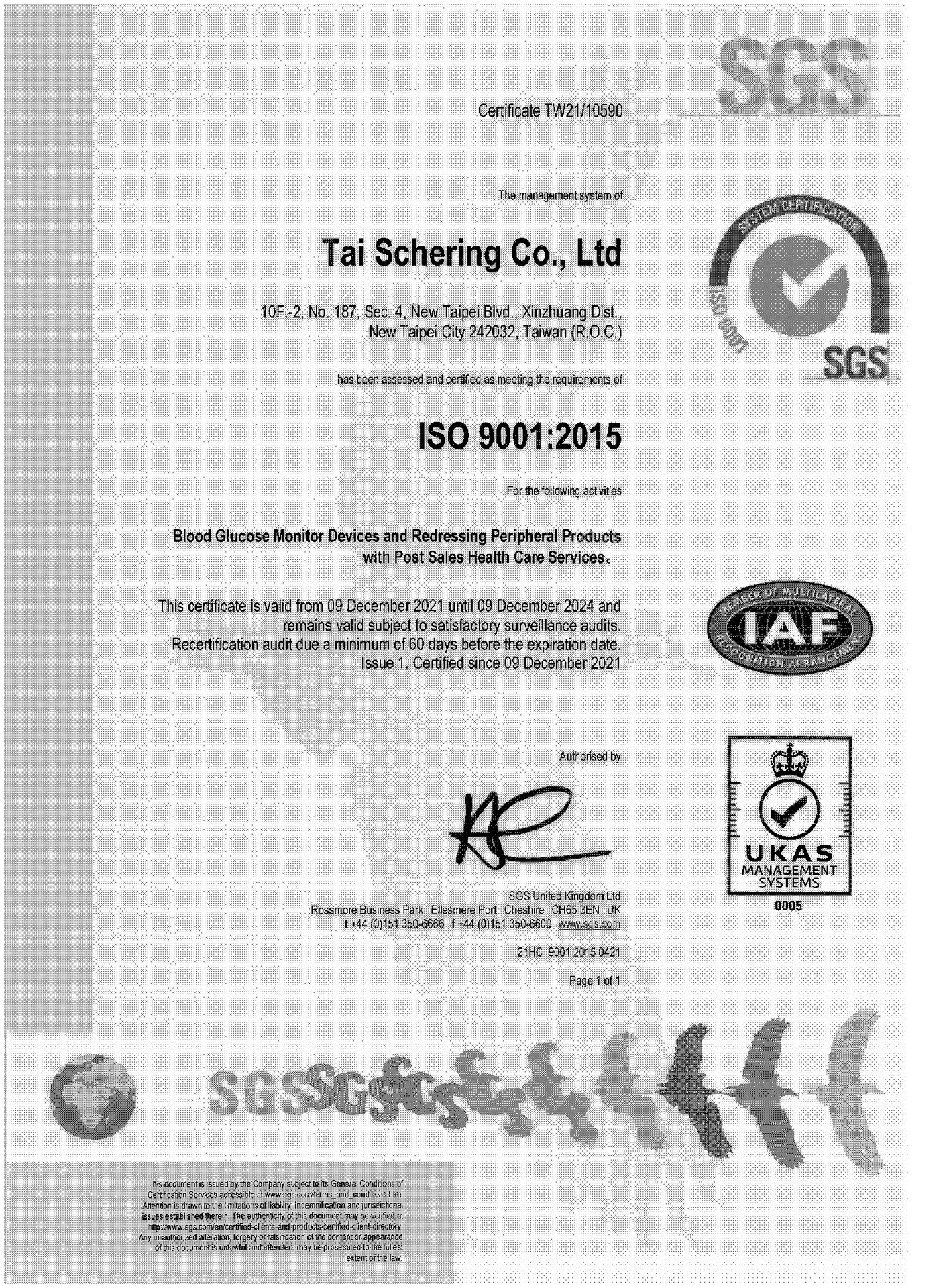 ▲泰先齡榮獲 SGS 核發的 ISO 9001 證書
