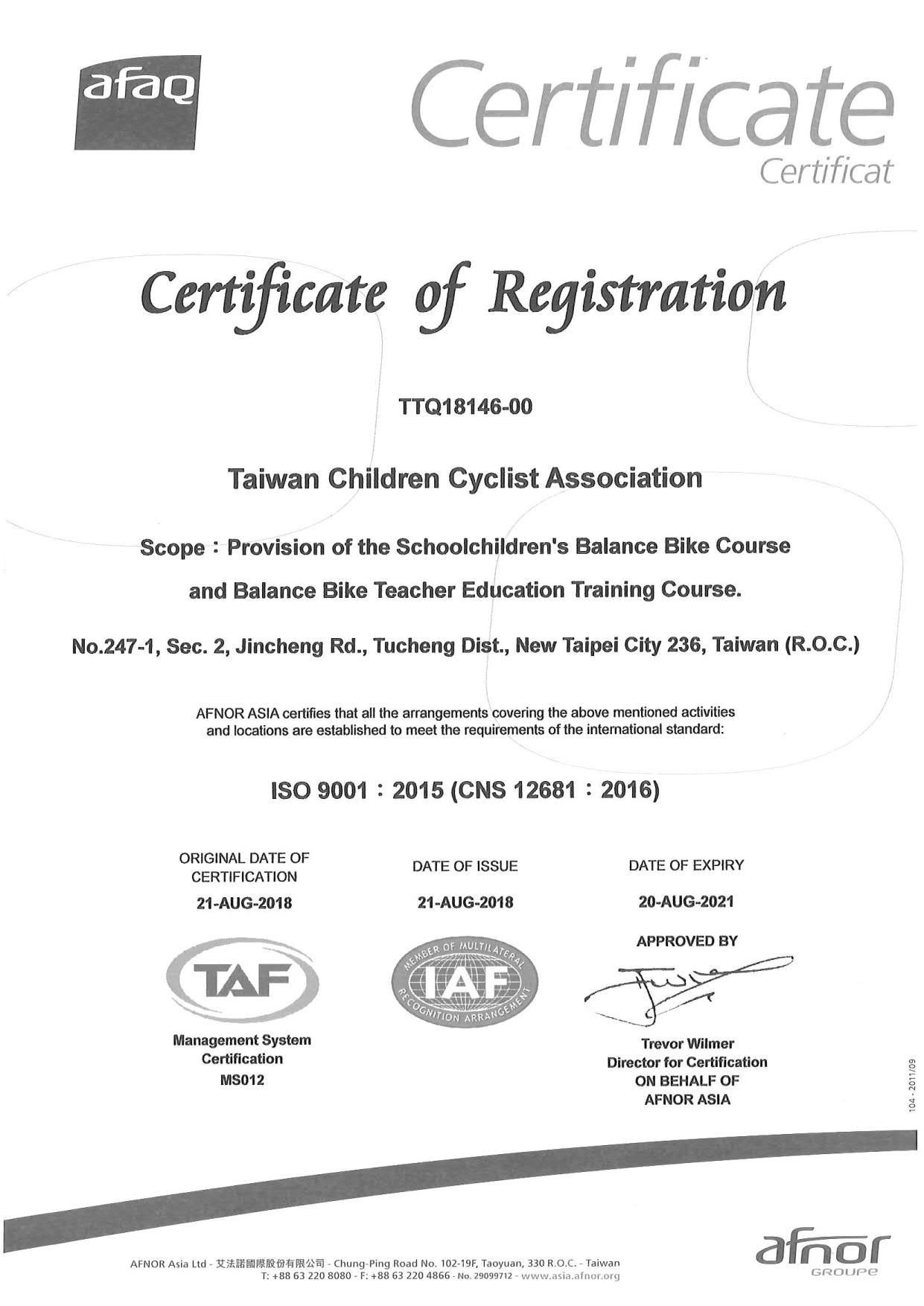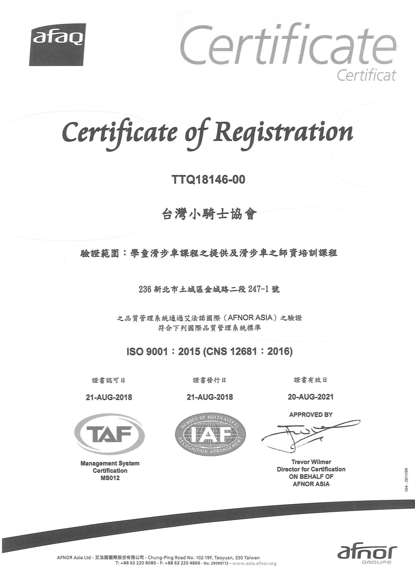 在領導力企管專業顧問輔導下,台灣小騎士協會已順利完成 ISO 9001:2015 品質管理系統(ISO 9001:2015 Quality Management Systems)教育訓練(Training)、系統建置(Implementing)、外部稽核驗證(Certification)3大實施流程,並且獲頒 ISO 9001:2015 品質管理系統證書。