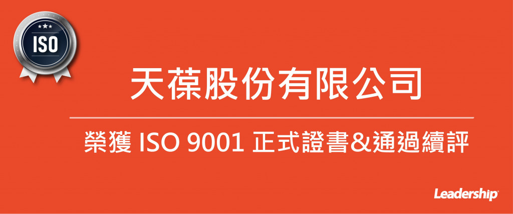 在領導力企管專業顧問輔導下,天葆股份有限公司已順利完成 ISO 9001:2015 系統(ISO 9001:2015 Quality Management Systems)教育訓練(Training)、系統建置(Implementing)、外部稽核驗證 (Certification)3大實施流程,順利取得 ISO 9001:2015 證書且通過續評。