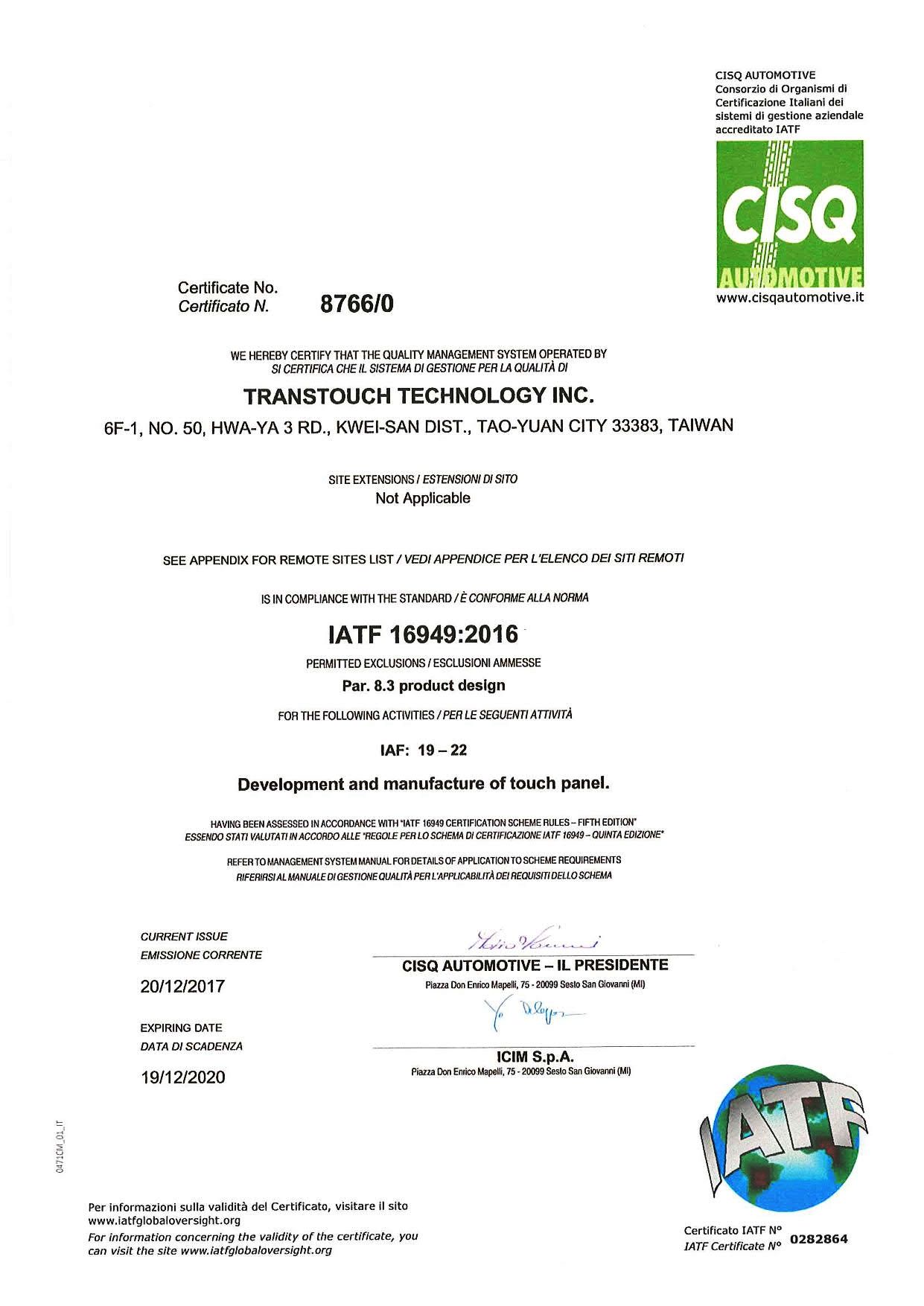 富晶通科技股份有限公司是領導力的老客戶,且早已通過 ISO 9001、ISO14001、 ISO/TS 16949、ISO 13485 第三方認證,現已成為符合國際化標準的整體規模企業,本次再次請領導力協助輔導 ISO 9001、IATF 16949、 ISO 9001 、ISO 13485及 AS9100,且順利通過認證,期待日益提升的品質標準與生產流程,提供國際客戶最高品質的產品與服務,為每位員工與公司創造更高的收益與成長。