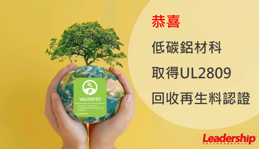 在領導力企管專業顧問輔導下, 低碳鋁材科技股份有限公司 順利完成 UL2809(永續環保新趨勢:UL 2809 回收料含量驗證)之教育訓練(Training)、系統建置(Implementing)、外部稽核驗證(Certification)3 大實施流程,並順利取得 UL2809 正式證書。