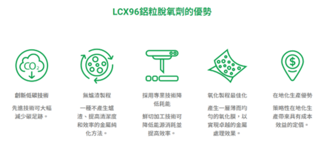 然而,低碳鋁材最新推出的 LCX96 脫氧劑是一款由回收材料打造的革命性產品。不僅採用了低碳製程的專利技術,還符合最嚴格的環保管理和永續法規要求,並在領導力輔導下通過了 UL 2809 回收料含量驗證。這款產品為鋼鐵產業提供了創新且環保的解決方案。我們專注於回收廢鋁,致力於提升廢鋁的使用價值,降低生產過程中的環境成本,並實現資源循環利用的目標。