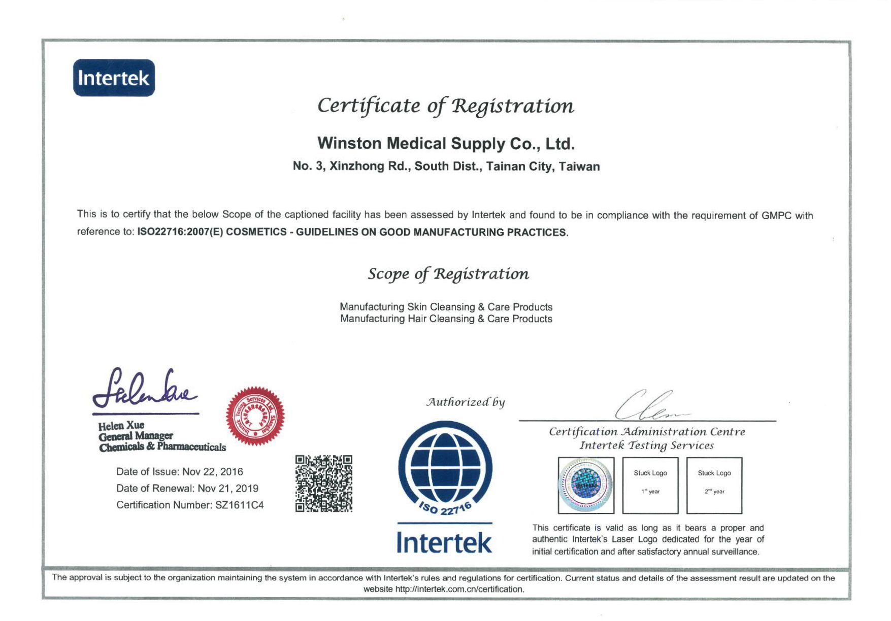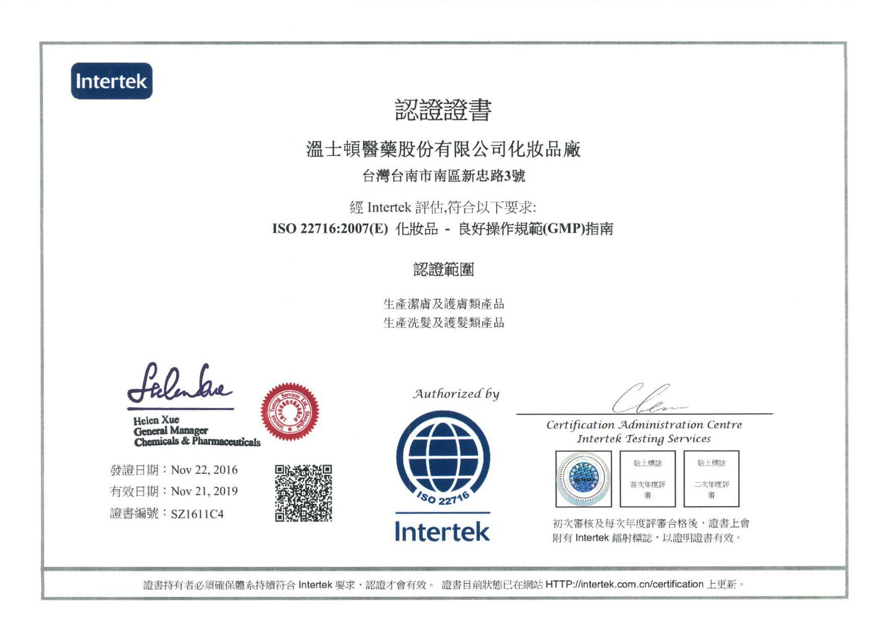 在領導力企管專業顧問輔導下,溫士頓醫院股份有限公司已順利完成 ISO 22716:2007 國際化妝品優良製造規範指引系統建置(Implementing)、教育訓練(Training)、外部稽核驗證 (Certification)3大實施流程,並且榮獲 INTERTEK 頒發 ISO 22716:2007 國際化妝品優良製造規範指引證書。