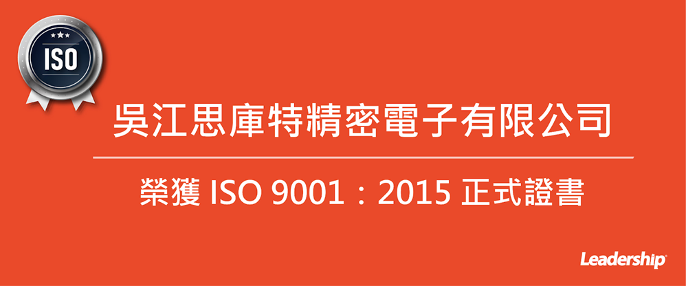 在領導力企管專業顧問輔導下,吳江思庫特精密電子有限公司已順利完成 ISO 9001:2015系統(ISO 9001 :2015 Quality Management Systems)教育訓練(Training)、系統建置(Implementing)、外部稽核驗證 (Certification)3大實施流程,並順利取得 ISO 9001 :2015證書。
