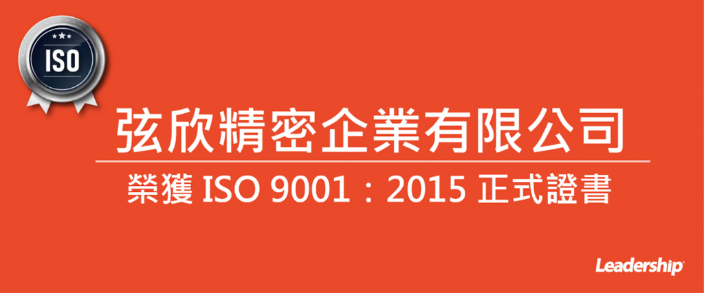 在領導力企管專業顧問輔導下,弦欣精密企業有限公司已完成 ISO 9001:2015 品質管理系統(ISO 9001 :2015 Quality Management Systems)教育訓練(Training)、系統建置(Implementing)、外部稽核驗證 (Certification)3 大實施流程,順利取得 ISO 9001 :2015 品質管理系統證書。