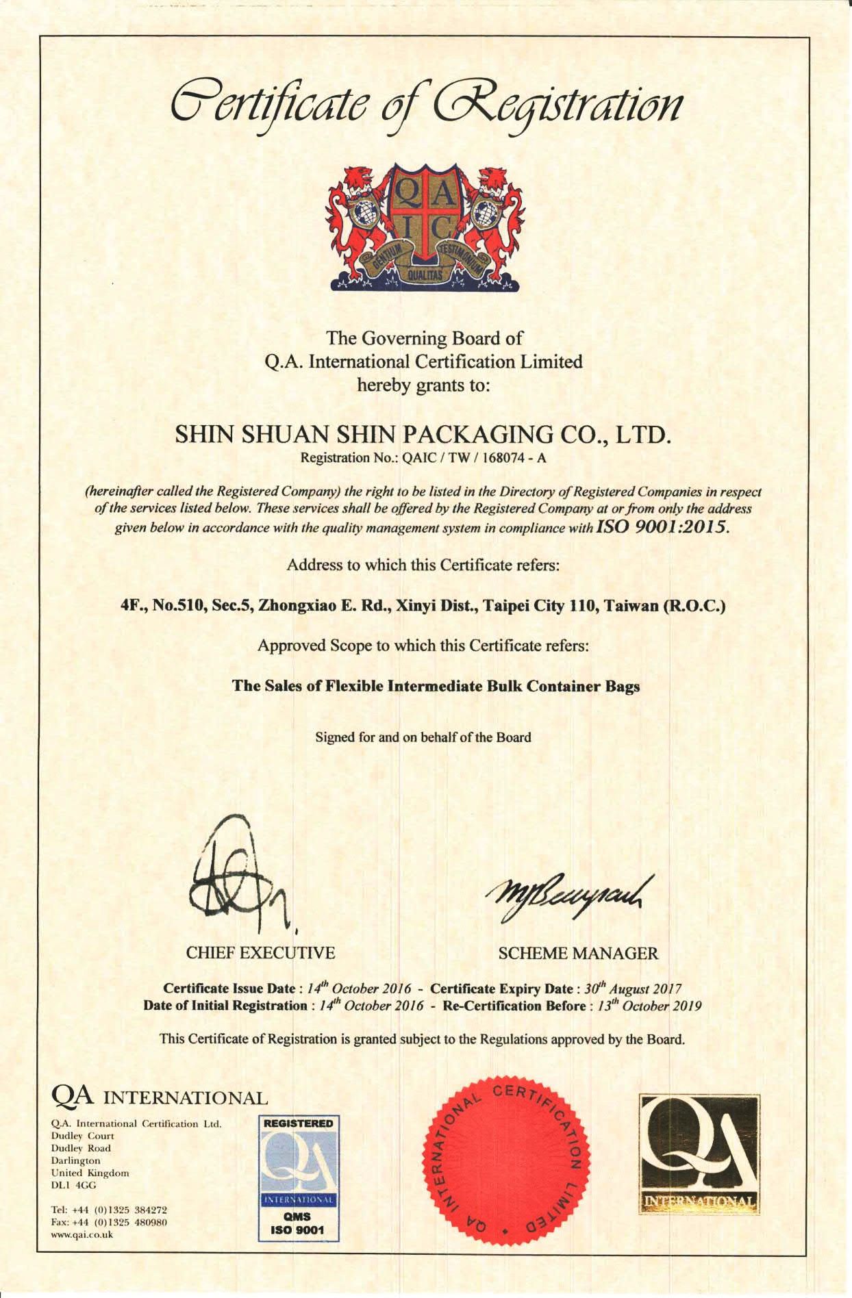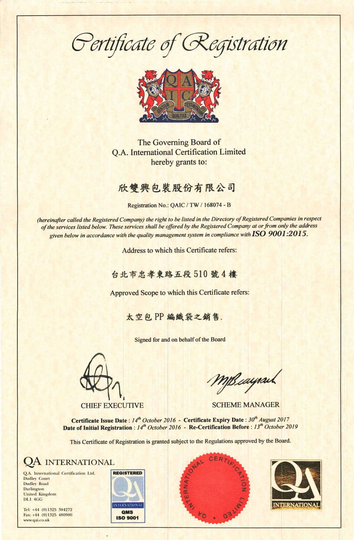 在領導力企管專業顧問輔導下,欣雙興包裝股份有限公司已順利完成 (ISO 9001:2015 品質管理系統(ISO 9001:2015 Quality Management Systems)教育訓練(Training)、系統建置(Implementing)、外部稽核驗證 (Certification)3大實施流程,並且榮獲 QA頒發 ISO 9001:2015 品質管理系統新版證書。