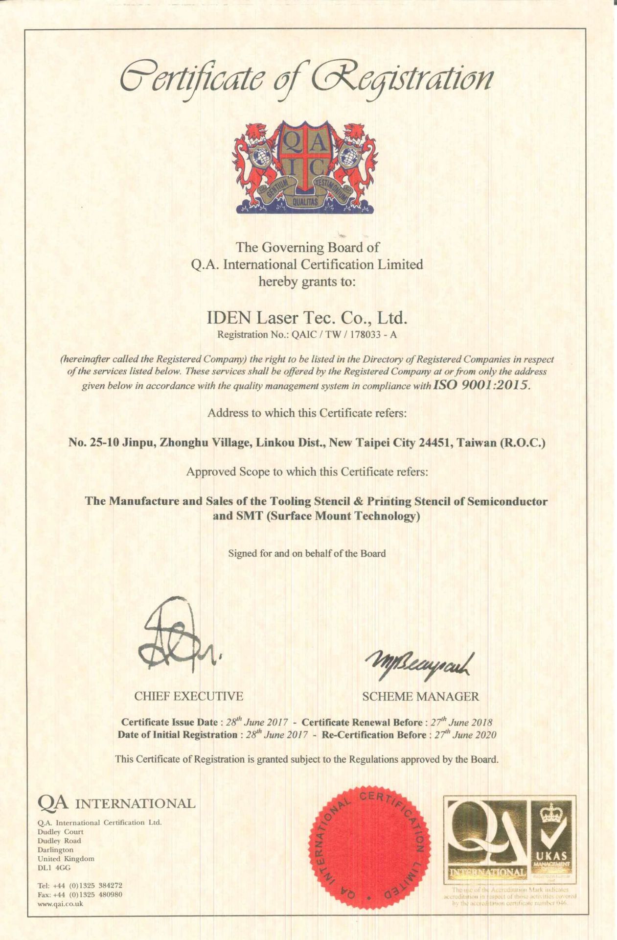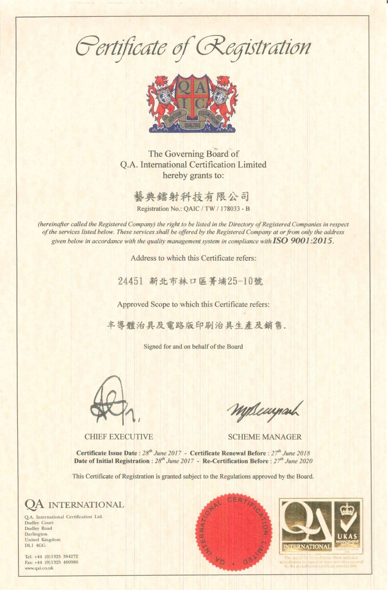 在領導力企管專業顧問輔導下,藝典鐳射科技有限公司已順利完成 ISO 9001:2015 品質管理系統( ISO 9001:2015 Quality Management Systems) 教育訓練(Training)、系統建置(Implementing)、外部稽核驗證 (Certification)3大實施流程,並且榮獲QA頒發 ISO 9001:2015 品質管理系統新版證書。