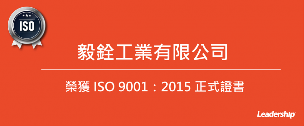 在領導力企管專業顧問輔導下,毅銓工業有限公司已順利完成 ISO 9001 :2015系統(ISO 9001 :2015 Quality Management Systems)教育訓練(Training)、系統建置(Implementing)、外部稽核驗證 (Certification)3大實施流程,順利取得 ISO 9001 :2015證書。