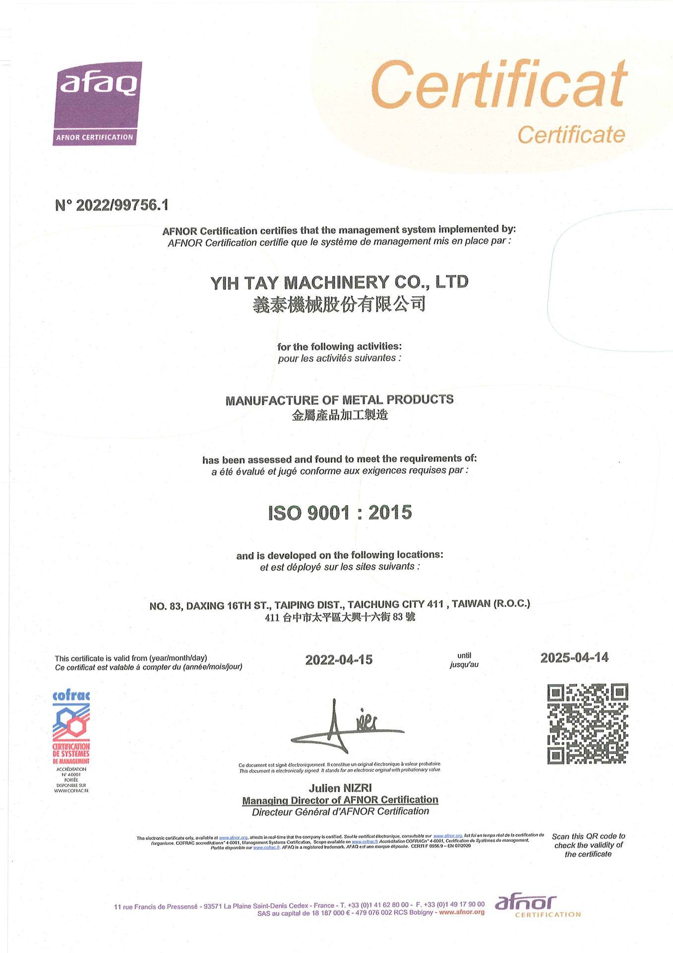 ▲恭喜義泰機械取得 ISO 9001:2015 正式證書