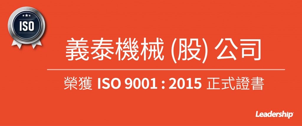 在領導力企管專業顧問輔導下,義泰機械股份有限公司 已順利完成 ISO 9001 :2015 系統(ISO 9001:2015 Quality Management Systems)教育訓練(Training)、系統建置(Implementing)、外部稽核驗證(Certification)3大實施流程,順利取得 ISO 9001 :2015 證書。