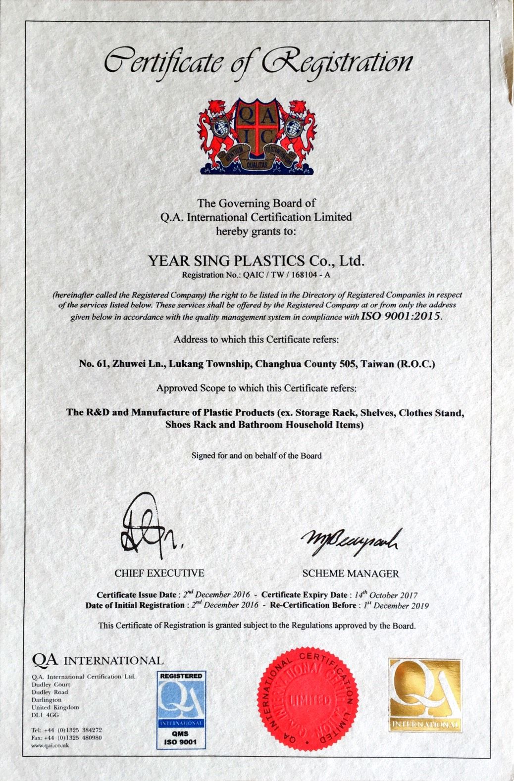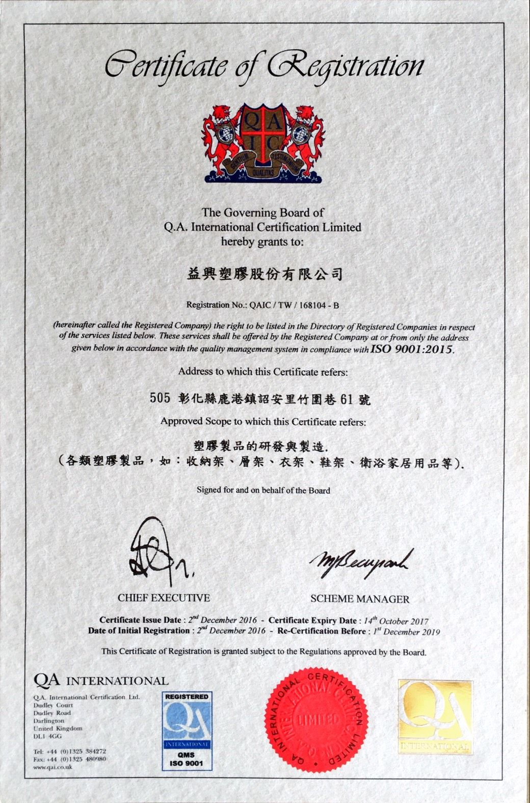 在領導力企管專業顧問輔導下,益興塑膠股份有限公司已順利完成 ISO 9001:2015 品質管理系統(ISO 9001:2015 Quality Management Systems)教育訓練(Training)、系統建置(Implementing)、外部稽核驗證 (Certification)3大實施流程,並且榮獲 QA頒發 ISO 9001:2015 品質管理系統新版證書。