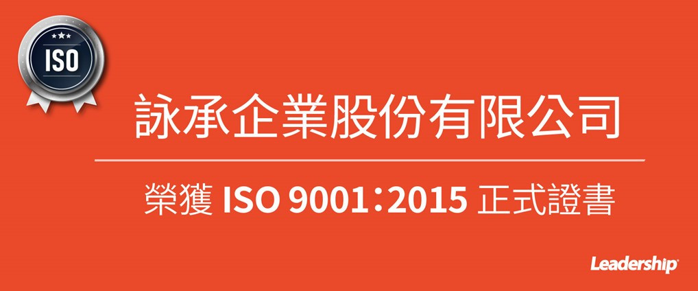 在領導力企管專業顧問輔導下,詠承企業股份有限公司 已順利完成 ISO 9001 品質管理系統(ISO 9001:2015 Quality Management Systems)的教育訓練(Training)、系統建置(Implementing)、外部稽核驗證(Certification)3大實施流程,順利取得 ISO 9001 : 2015 品質管理系統證書。