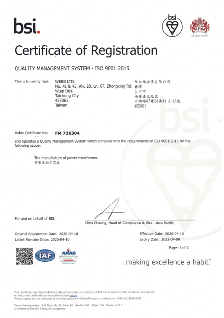 元大維為因應客戶各式的產業型態、提供更多樣化的生產與代客設計、製造等服務,因此積極投入研發及申請各式認證,目前擁有變壓器專利及 UL、CE/TUV/VDE、RoHS2.0…等各式認證,此次請領導力企管協助建置 ISO 9001 :2015 品質管理系統,使公司更能獲得客戶信賴。元大維企業欲導入品質管理系統已久,因此在人員增補後第一時間即選擇領導力合作。在輔導過程中,承辦人員及各部門皆相當努力學習,亦對流程執行給予反饋,因此在預定時間內順利通過 ISO 9001 認證。領導力感謝本專案相關人員全力投入,讓元大維的珍貴技術能獲得更多國際知名品牌的信賴及採用。