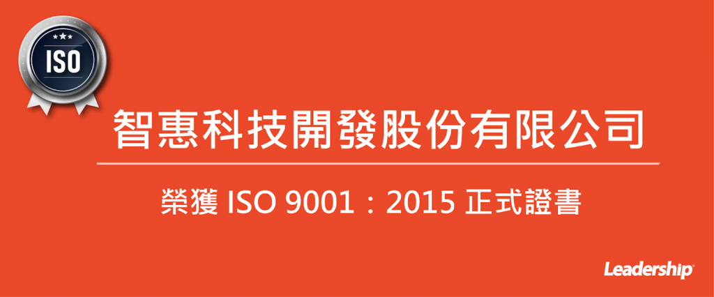 在領導力企管專業顧問輔導下,智惠科技開發股份有限公司已順利完成 ISO 9001 :2015 系統 (ISO 9001 :2015 Quality Management Systems)教育訓練(Training)、系統建置(Implementing)、外部稽核驗證 (Certification)3大實施流程,順利取得 ISO 9001:2015證書。