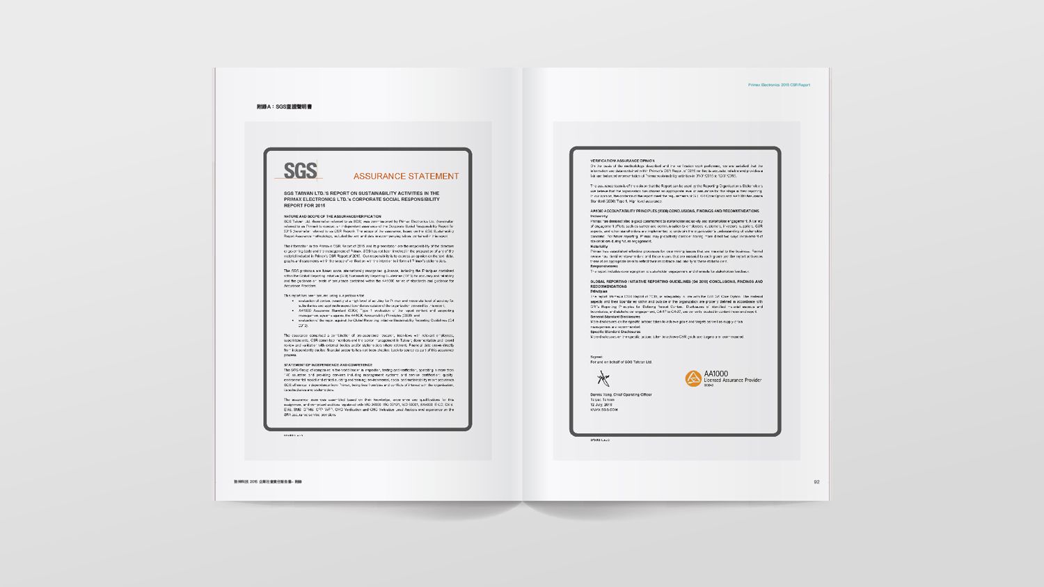 致伸科技企業社會責任報告書特色1:由 SGS 頒發 AA1000 Assurance Standard High Assurance 查證聲明