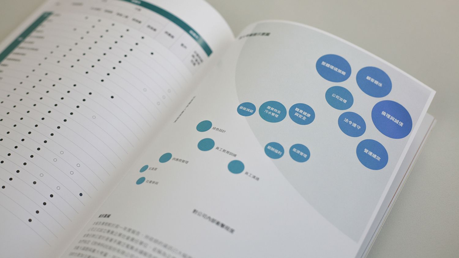 連小學生都聽過這句話:「1張圖片勝過千言萬語。」然而在企業社會責任報告書實際執行而言,難度非常高,主因就在跨部門資訊蒐集不易,通常都是等到逼近截稿時間時才陸續交給承辦窗口,面對截稿在即,能夠把正確資訊呈現就已不易,更遑論達到圖文精美的版面設計。也因如此,我們常在國內企業的報告書或企業年報裡,看到充滿密密麻麻文字,或是很傳統的版型設計。為了讓國內企業的報告書能媲美歐美頂尖外商公司,領導力企管引進一批影像製作團隊,採用資訊圖表(inforgraphic)視覺設計手法,為客戶執行報告書版面編排。什麼是資訊圖表設計?簡單來說,就是採用圖片大於文字的設計手法呈現訊息。然而,以同樣1個跨頁的版面來說,資訊圖表的製作時間相較於一般版型設計,所花費的時間長達3倍以上!這是由於資訊圖表必須由文案團隊消化文字內容,再交由視覺編輯團隊繪製腳本(script),然後請攝影團隊拍攝圖片,透過一連串事前精密的企劃,最後一站才送交設計團隊著手排版。事實上,這幾乎是拍攝電視廣告甚至甚至微電影影像作品才有的工序。領導力企管專案經理王聖源說:我們的製作團隊都是來自外商廣告公司的高手,對於製作出媲美國際級企業的作品深具信心,我們甚至用拍電影的製作流程來協助企業編製報告書。這是因為我們也很希望把國外的設計趨勢與標準製程引進國內,讓國內的企業社會責任報告書水準也能與國際接軌。