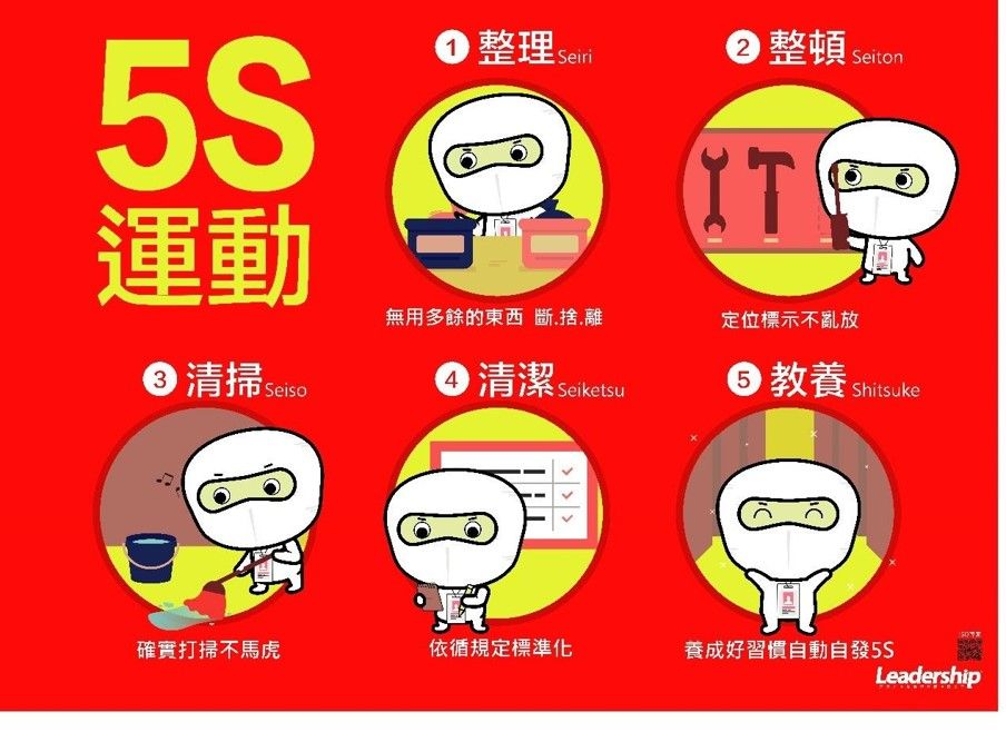 - 5S-5 教養:自動自發,無人管理、自主管理。