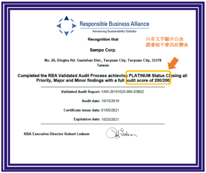 SAMPO聲寶公司選擇領導力企管協助導入與推行 RBA行為準則並完成 VAP稽核,協助聲寶導入 RBA行為準則的顧問師表示:「滿分200分的榮耀時為難得,其中 9成來自客戶本身的努力以及善待員工、善待環境、善待社會的基本工作的紮實,顧問只是輔助,並適時提供資訊而已,成功關鍵仍在企業本身體制的完整度。」