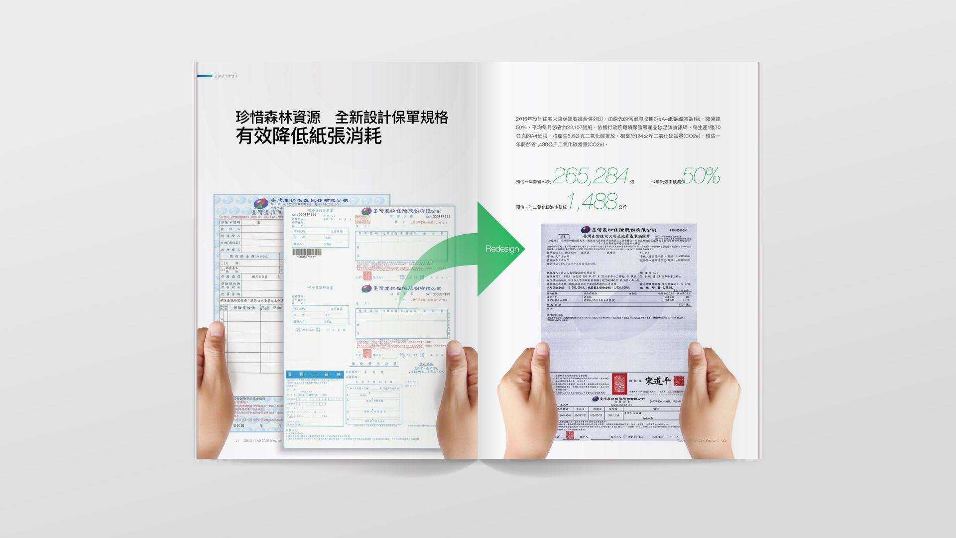 領導力企管於臺產實施 GRI G4 教育訓練過程中指出,相較於製造業,金融業在GRI G4環境類別指標的具體作為,能夠努力的工作的確較少。然而,面對地球日益減少的森林面積,金融業若能持續減少紙張耗用,將是落實綠色製程的具體實踐。因此,臺產在為期近1年的企劃與試營運過程後,2015年全新設計住宅火險保單收據合併列印,由原先的保單與收據2張A4紙張縮減為1張,降幅達50%,平均每月節省約22,107張紙,依據行政院環境保護署產品碳足跡資訊網,每生產1張70公克的A4紙張,將產生5.6公克二氧化碳排放,相當於124公斤二氧化碳當量(CO2e),預估每年將節省1,488公斤二氧化碳當量(CO2e)。而在報告書版面呈現上,領導力企管發揮最擅長的資訊圖表(inforgraphic)設計手法,透過圖像化的設計清楚傳達保單設計前後所產生的絕佳效益。