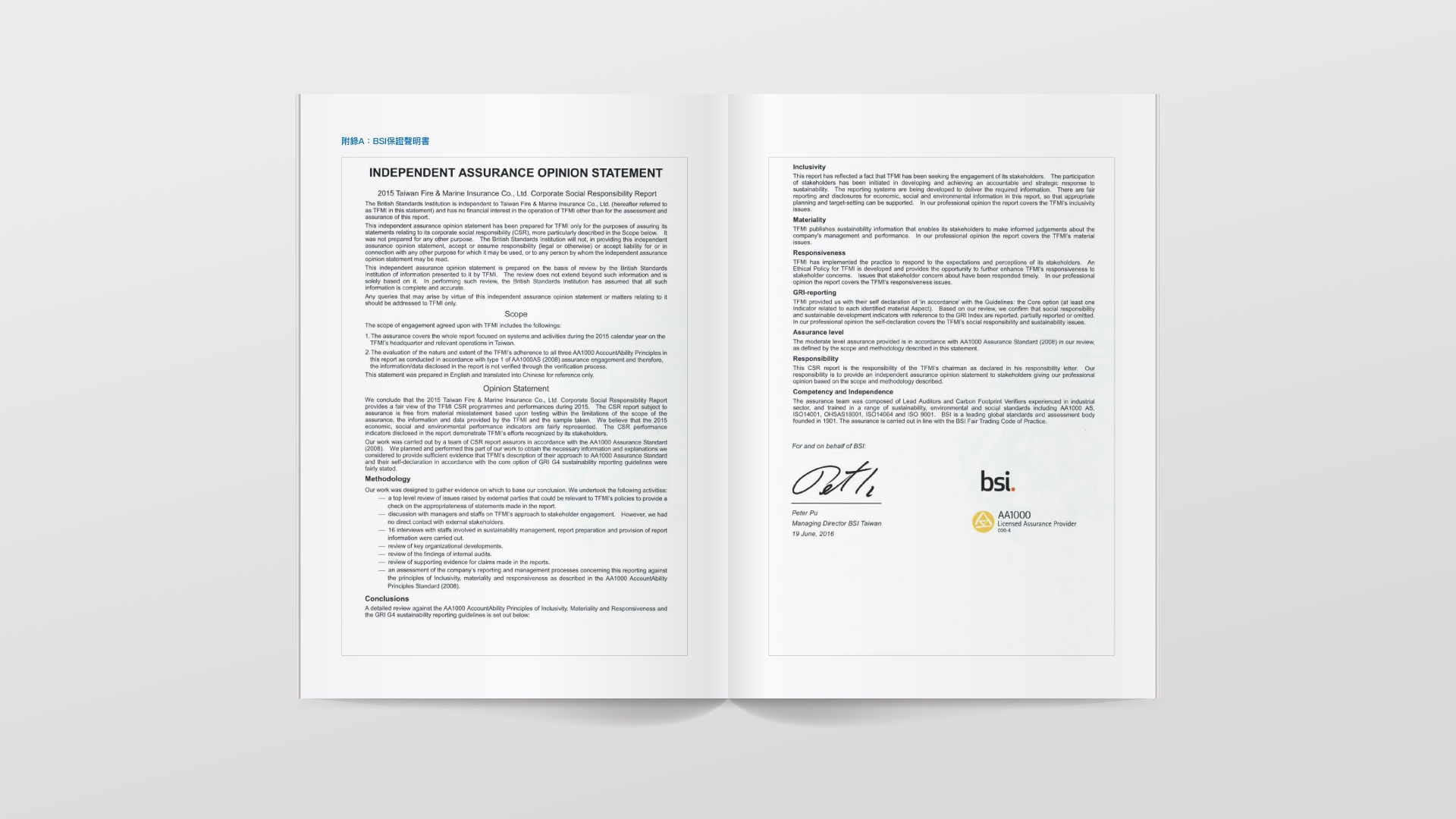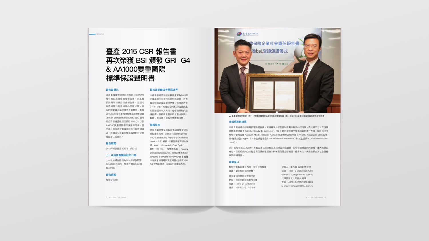 臺灣產物保險連續2年選擇領導力企管,編製 2014 / 2015 企業社會責任報告書,榮獲 BSI 頒發 GRI G4 & AA1000雙重國際標準保證聲明書