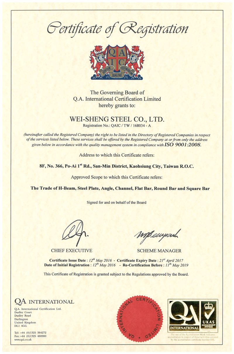 在領導力企管專業顧問輔導下,維勝鋼鐵股份有限公司已順利完成 ISO 9001 品質管理系統 (ISO 9001 Quality Management Systems) 教育訓練(Training)、系統建置(Implementing)、外部稽核驗證 (Certification)3大實施流程,並且榮獲 QA 頒發 ISO 9001 品質管理系統證書。維勝鋼鐵股份有限公司,成立於1975年,目前在台南和屏東都設有倉庫和加工廠,現為國內最大H型鋼庫存經銷商,維勝鋼鐵主要的產品有:H型鋼、鋼板、鋼軌、花紋鋼板、方鐵、圓鐵、扁鐵、窄幅鋼板、工字鐵、角鐵、槽鐵、覆工板(鈑)…等。維勝鋼鐵自創立以來,秉持誠信、建立品牌價值,以客製化服務為最重要的經營目標,目的就是能夠成為客戶長遠信賴的合作夥伴。不僅是國內庫存商中第一個擁有專屬加工設備的公司,更是中鋼集團中龍鋼鐵公司最大的經銷商之一。為了能夠更進一步使產品和服務的品質符合市場標準及客戶的需求,維勝鋼鐵在2016年5月由透過領導力企管協助,正式通過 ISO 9001 品質管理系統稽核,在系統化管理的幫助下,讓公司的營運更加健全完備,達到 郭石煌董事長所說的「維持勝利、反敗為勝」的理念。