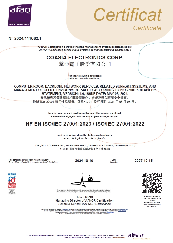 在領導力企管的專業輔導下,擎亞電子股份有限公司(股票代號:8096)已順利完成 ISO 27001:2022 資訊安全管理系統的三大實施流程,包括 教育訓練(Training)、系統建置(Implementing) 以及 外部稽核驗證(Certification),並正式取得 ISO 27001:2022 國際證書。