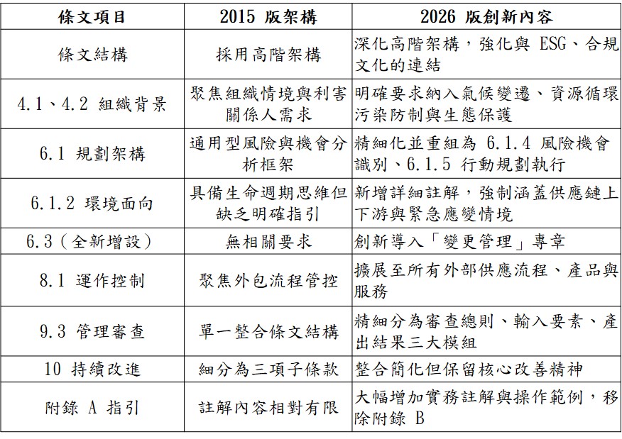 以下為 ISO 14001:2026 草案的關鍵條文變革解析(相較於現行 2015 版):